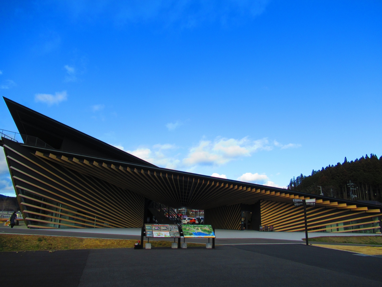 隈研吾の設計の奇抜なデザインの建物です。