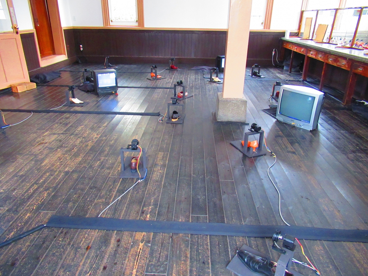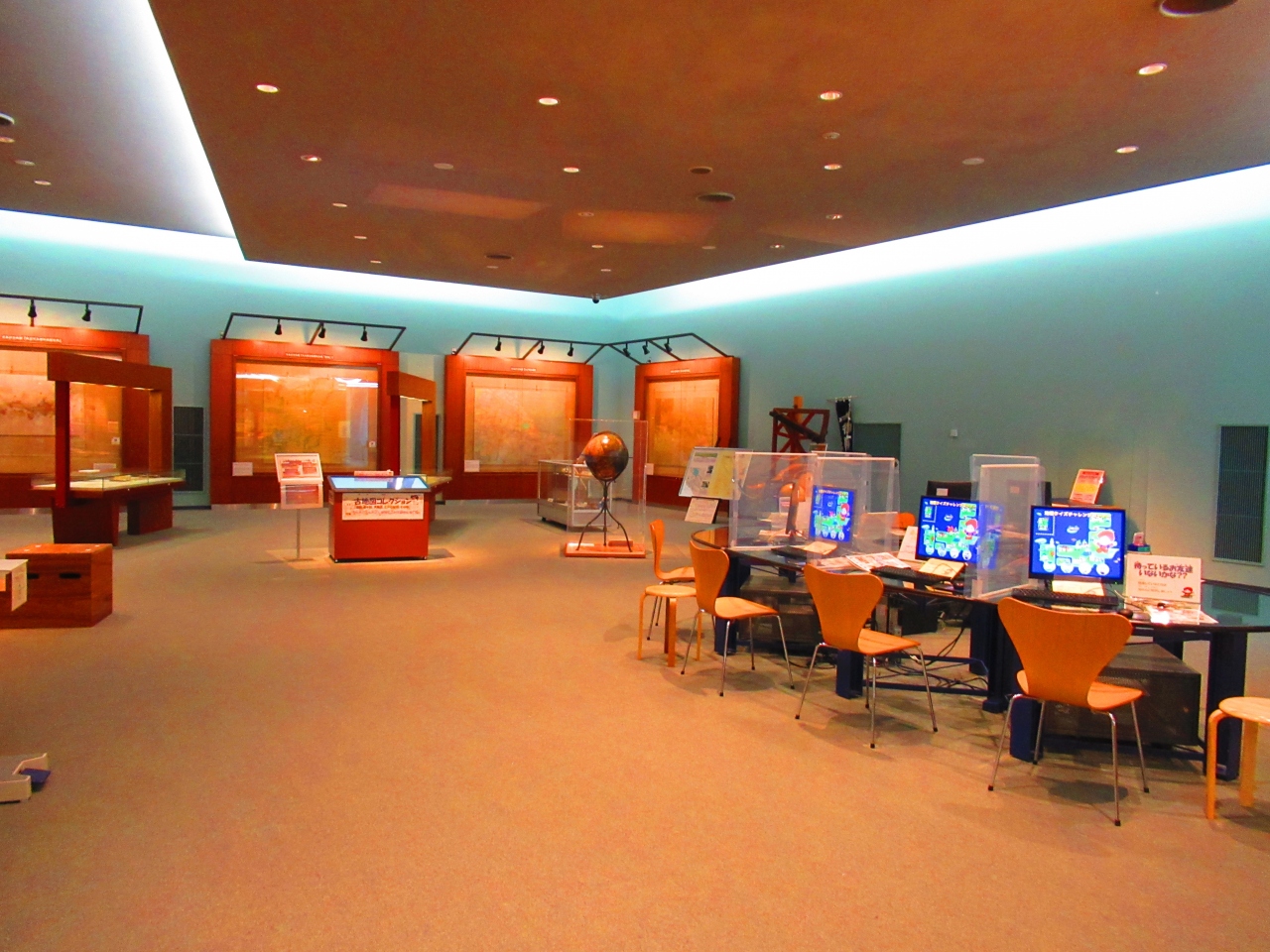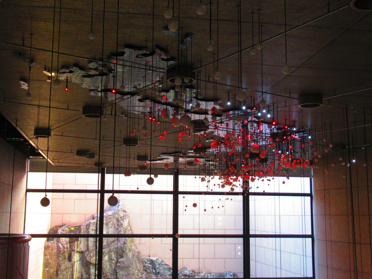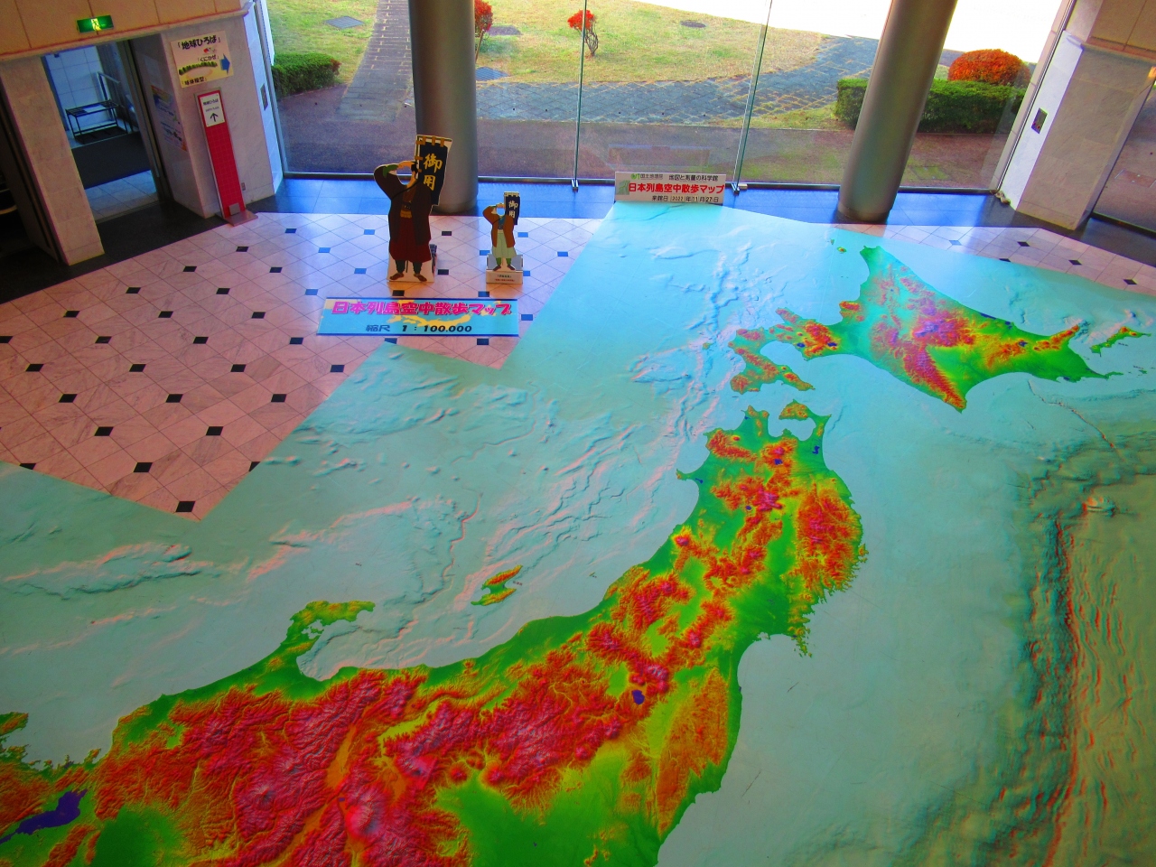 ホールの天井が吹き抜けになっていて、裏からみた日本地図が描かれています。そこから白い球と赤い球がぶら下がっていて、それが過去に起こった地震の震源の深さとマグニチュードの大きさを表していて、赤い球は被害のあった地震を表しているとのことです。こんなに多くの地震が起こっているのかという驚きと、それを一目瞭然で示した展示の仕方が秀逸だなと思いました。