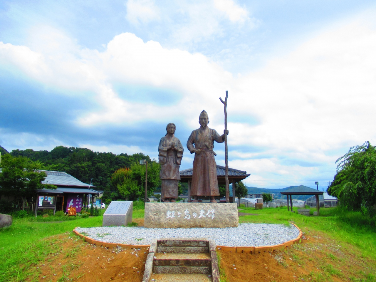 平治の乱で平清盛に敗れた源頼朝が流され、北条政子と過ごしたとされている場所で、二人の銅像があります。園内にある「蛭ケ島茶屋」では休憩や食事ができます。駐車場の方にある「旧上野家住宅」は歴史民俗資料館で、18世紀中頃以前に建てられたと推定される庶民農家の住宅が見学できます。