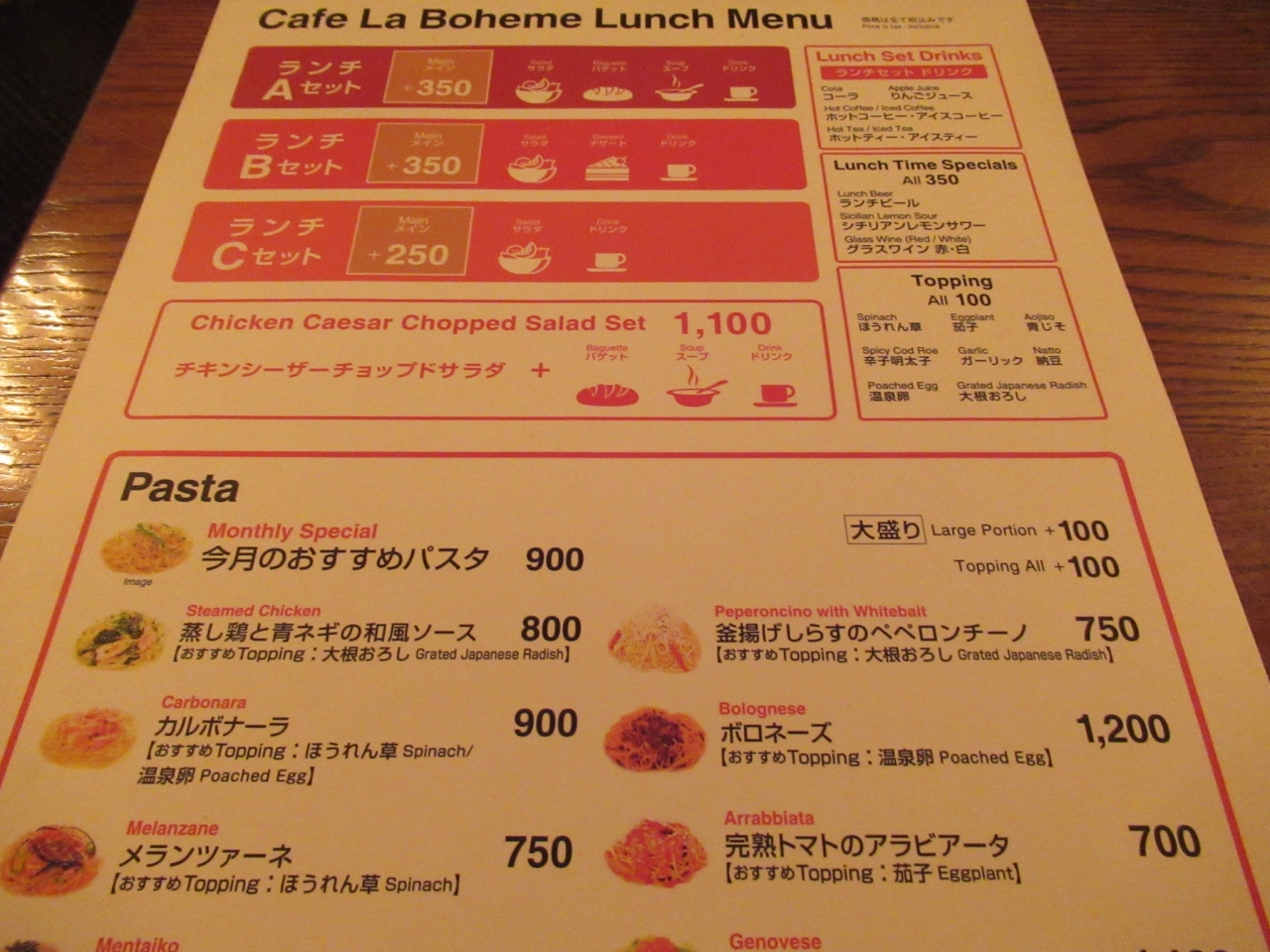 たくさんある「ラ・ボエム」の中でも最も有名なお店かと思います。ずいぶん前からありますが、近くに行ったので久しぶり訪れました。平日の昼間でも混んでいました。平日ランチは¥1000以内ぐらいの普通の値段でした。店内は薄暗いので、一人ランチでのんびりという雰囲気ではないです。