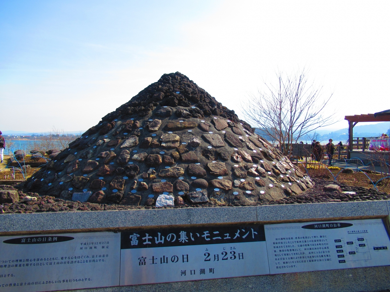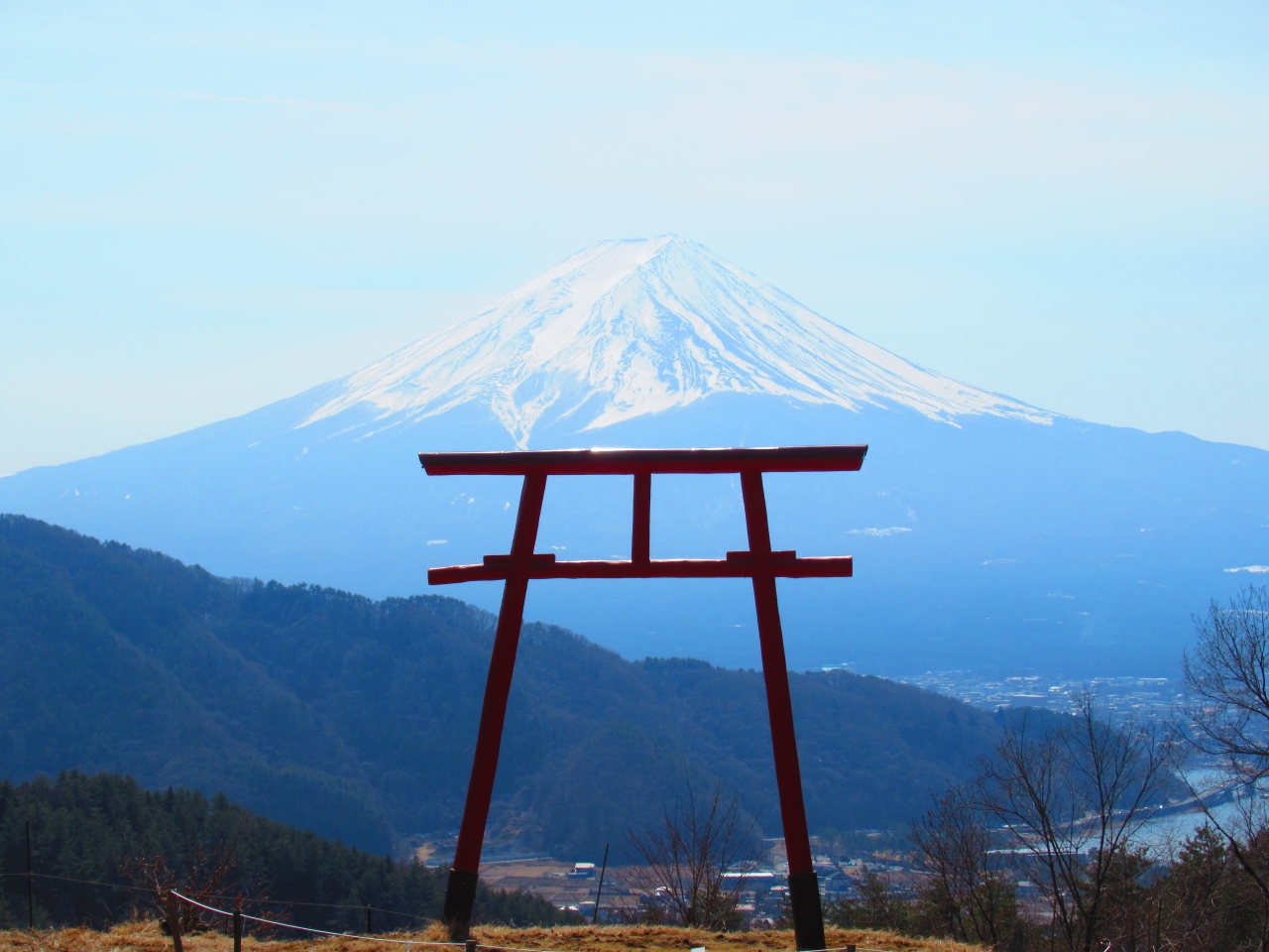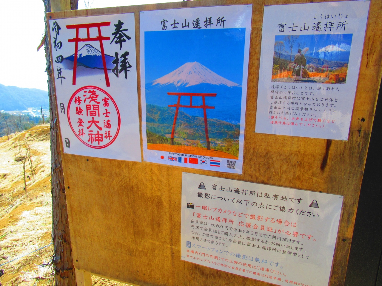 「河口浅間(あさま)神社」から車で10分ぐらいの、ご神体の富士山を仰ぎ見て拝むための「遥拝所」です。歩いて登ることもできるようです。まだ整備したばかりで工事中の感じですが、鳥居越しの富士山は絶景です。山麓斜面に桜を植えているので、いつか桜が咲くようになったらさらに素晴らしい景色になると思います。