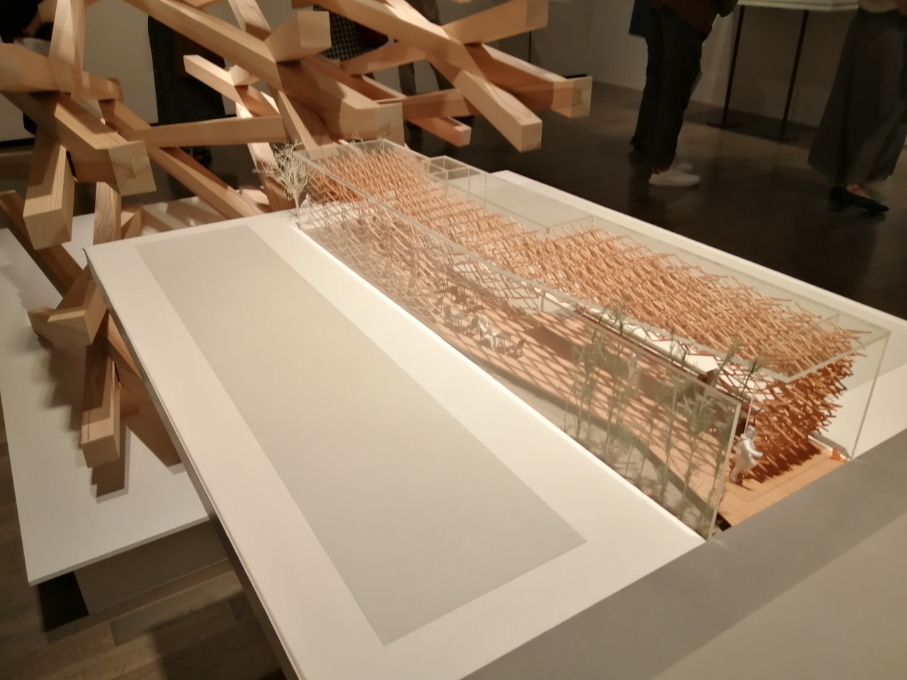 模型がたくさん展示されていて、模型の写真は撮ってもいいけど、解説文はダメということで、それだと後で写真を見たときに何の模型かわからなくなるので、模型に大きくプロジェクト名を書くなり、工夫してほしいと思いました。隈研吾は今大活躍の建築家、オリンピック開催中の国立競技場などの活躍の場の広さを感じました。