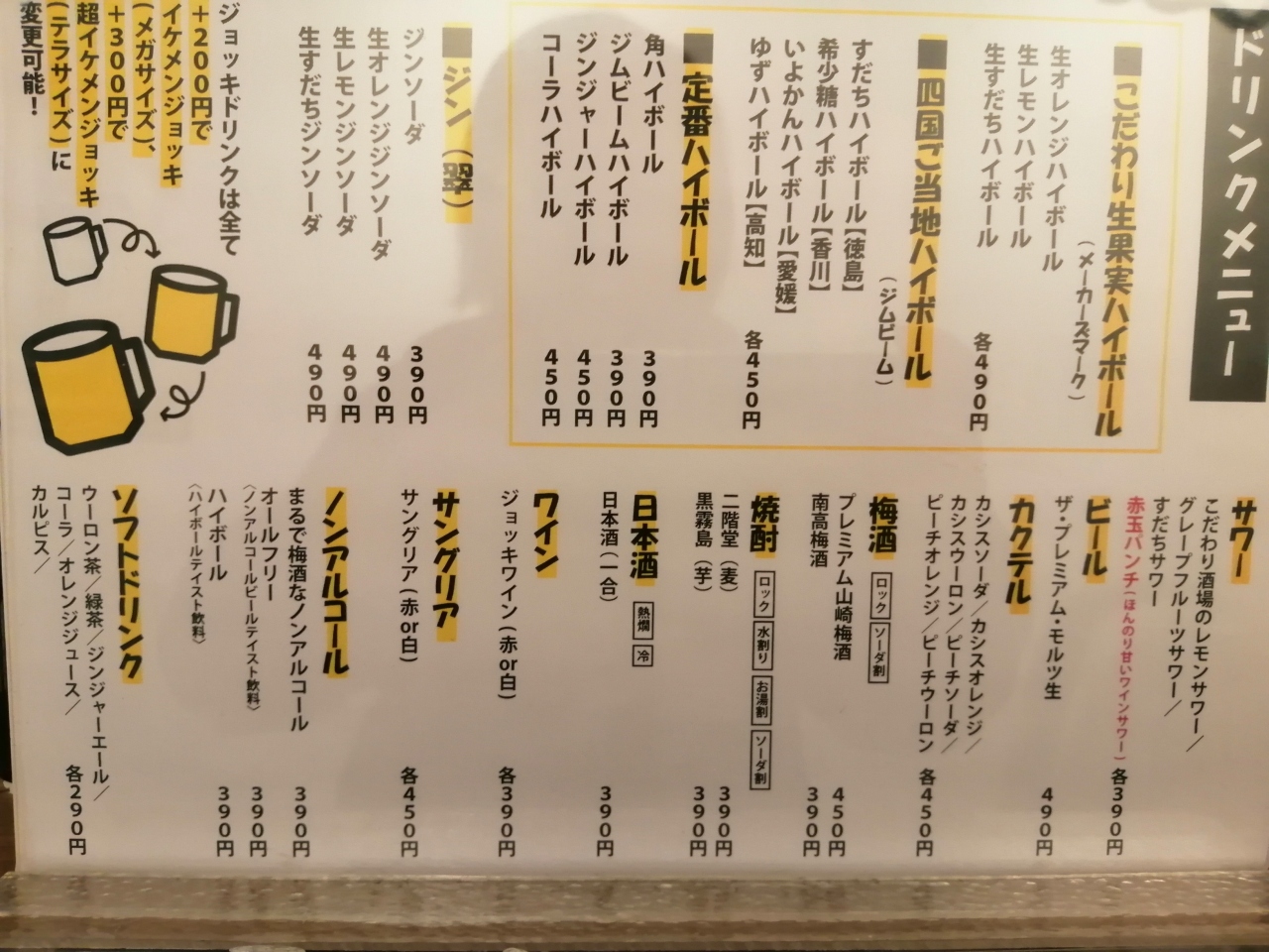 徳島駅の駅ビルクレメントプラザBIFのバル横丁にあります。空港行きのバスまでの1時間ぐらいあり、買い物もしたかったので食事する時間はないけど、1杯飲もうと立ち寄りました。食事メニューもいろいろあるようでした。唐揚げをつまみにすだちサワー。徳島で最後にやっとすだちを飲むことができました。