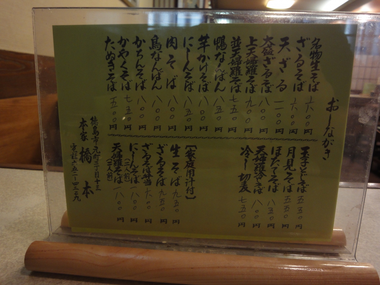 徳島の老舗のおそば屋さんです。徳島に来たら、ここのお蕎麦は必食でしょう。名物は“生(き)そば”。2012年に600円でしたから、今はもう少し値上がりしているかもしれません。