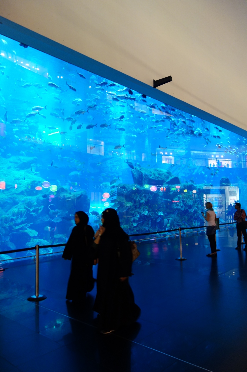 ドバイ・モールの中をふらふらと廻っていると、“水族館はあっち”と標示があり、行ってみると、大きな水槽が現れました。どうも、これがギネス認定世界一の巨大な水槽のようです。
