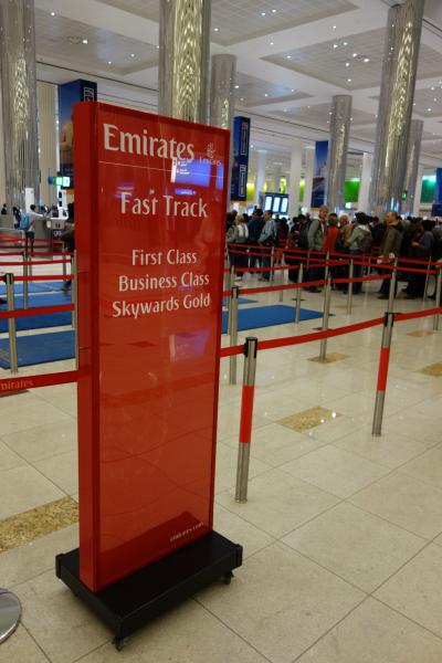 基本的に、スムーズなドバイ入国審査ですが、それでも少しは列ができていました。ファーストクラス・ビジネスクラスご利用の方々向けには、ファースト・トラックという特別のレーンが設けられていましたから、そちらをご利用ください!
