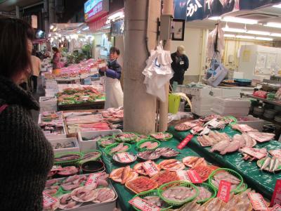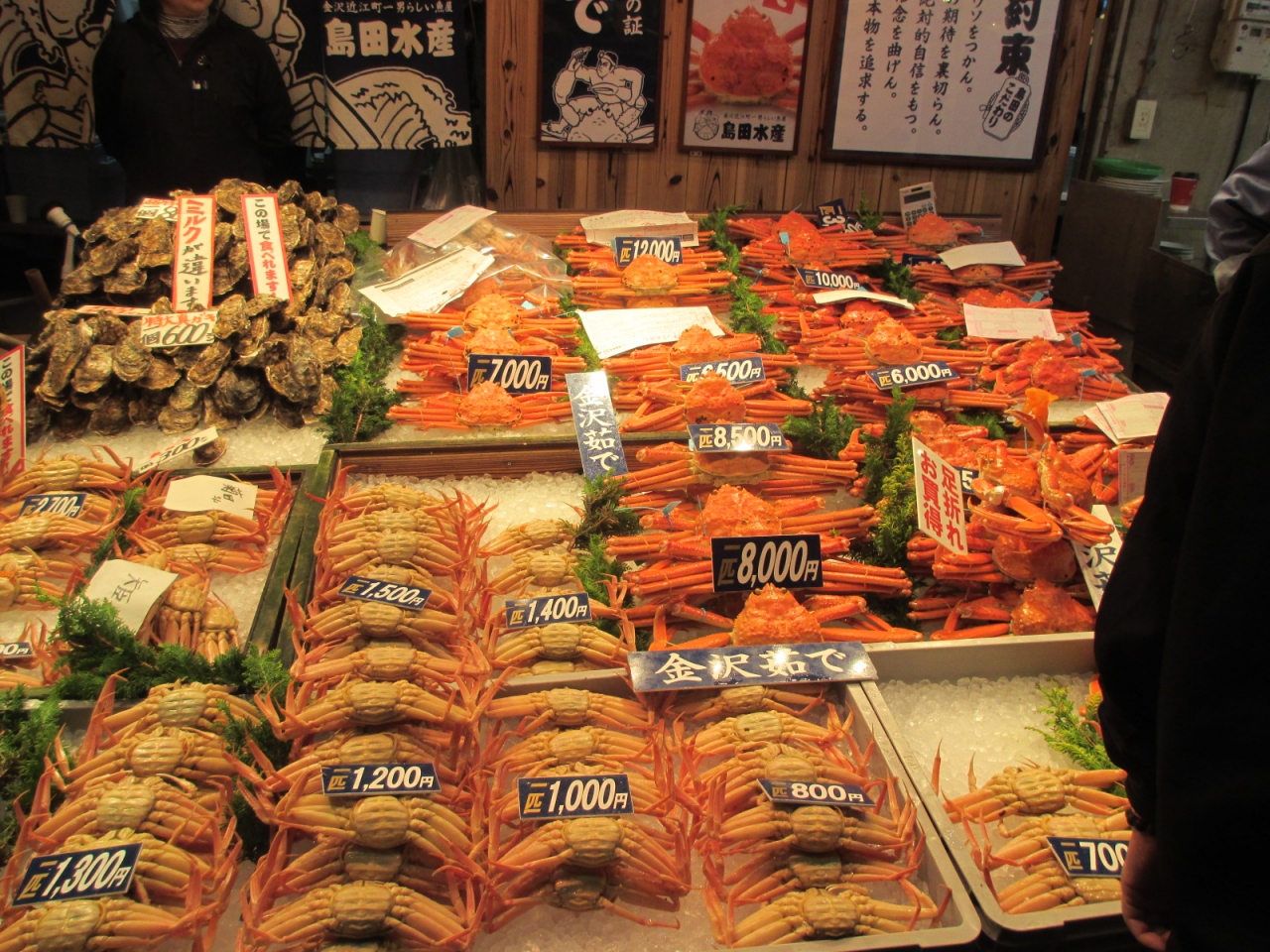 金沢観光の名所にひとつで、東京でいえば築地市場的な感覚ですが、市場業者はいません。 観光客は殆どここの2階に生鮮海産料理(刺身、蟹、ウニ、カキ等)を食べる人が多く、とても混雑しています、値段は東京と変わりません。
