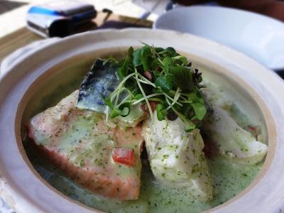 ワーテルゾーイはサーモン、サバ、白身(タラ?)などの魚とポテトが土鍋に入っていてボリュームたっぷり。あっさり味のクリームスープがとてもおいしかったです。