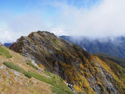椹島を出て吊橋を越え急坂の樹林帯を上っている最中に木々の間からチラッと見えた。