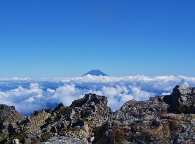 丸山そして悪沢岳に至るまでの柔らかな稜線、富士の眺め。