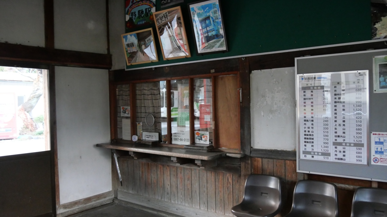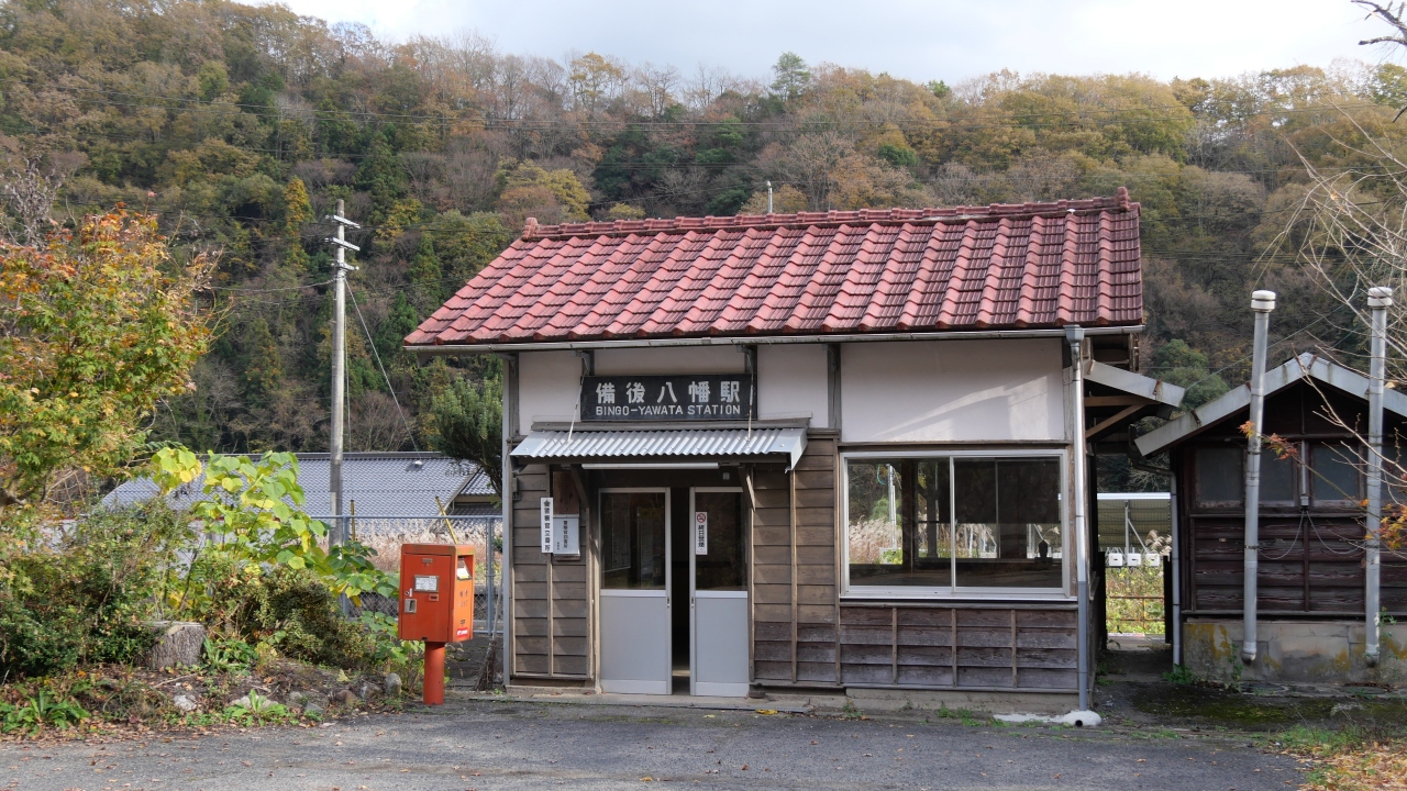 備後八幡駅の駅舎は旧国鉄型の木造駅舎から、駅事務室部分を撤去し、待合室だけが残っている駅。
