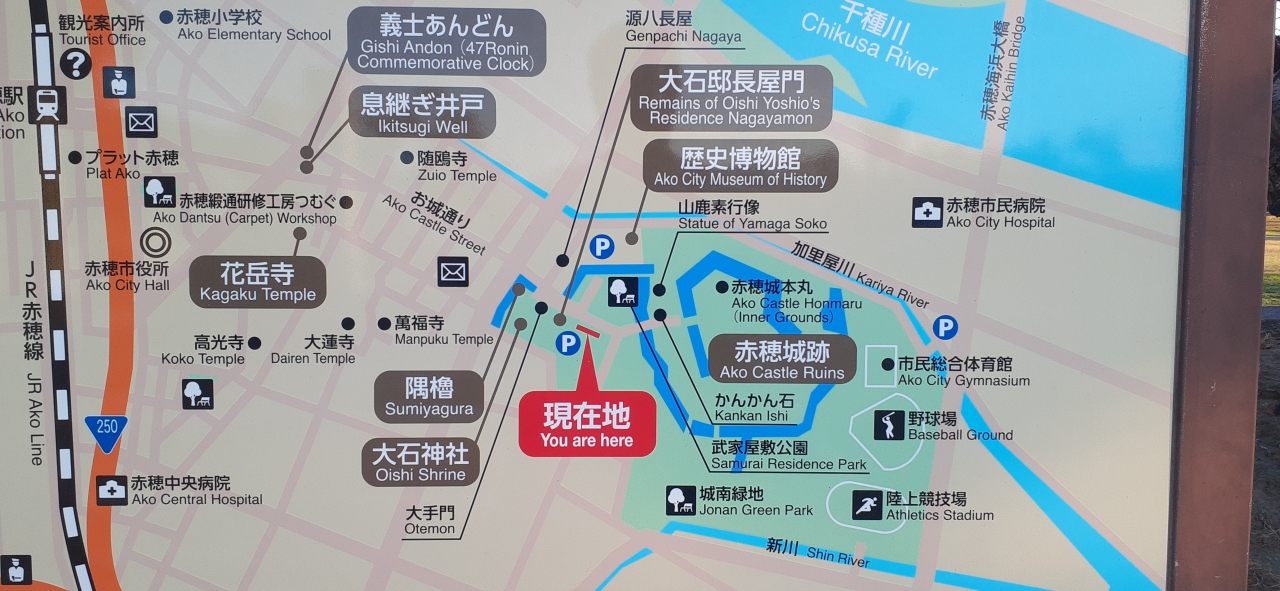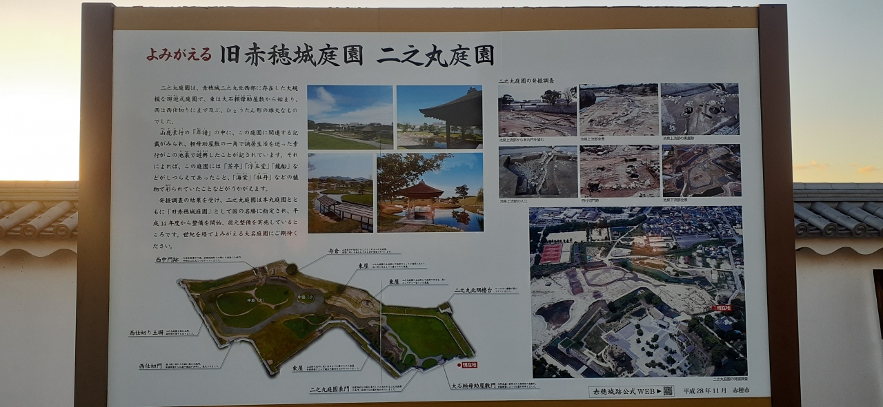 大石内蔵助など重臣の屋敷のあった三の丸、庭園のある二の丸、そして藩主の住まいだった本丸が門や櫓などが復元され、公園として整備されていました。