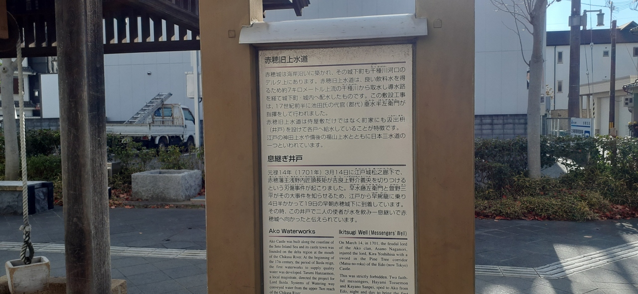 1614年、つまり徳川家康の最後の大戦である大坂の陣のあった年からここ赤穂では上水道が整備され始め、市内各所に通じていたそうで驚きました。- 旅行時期