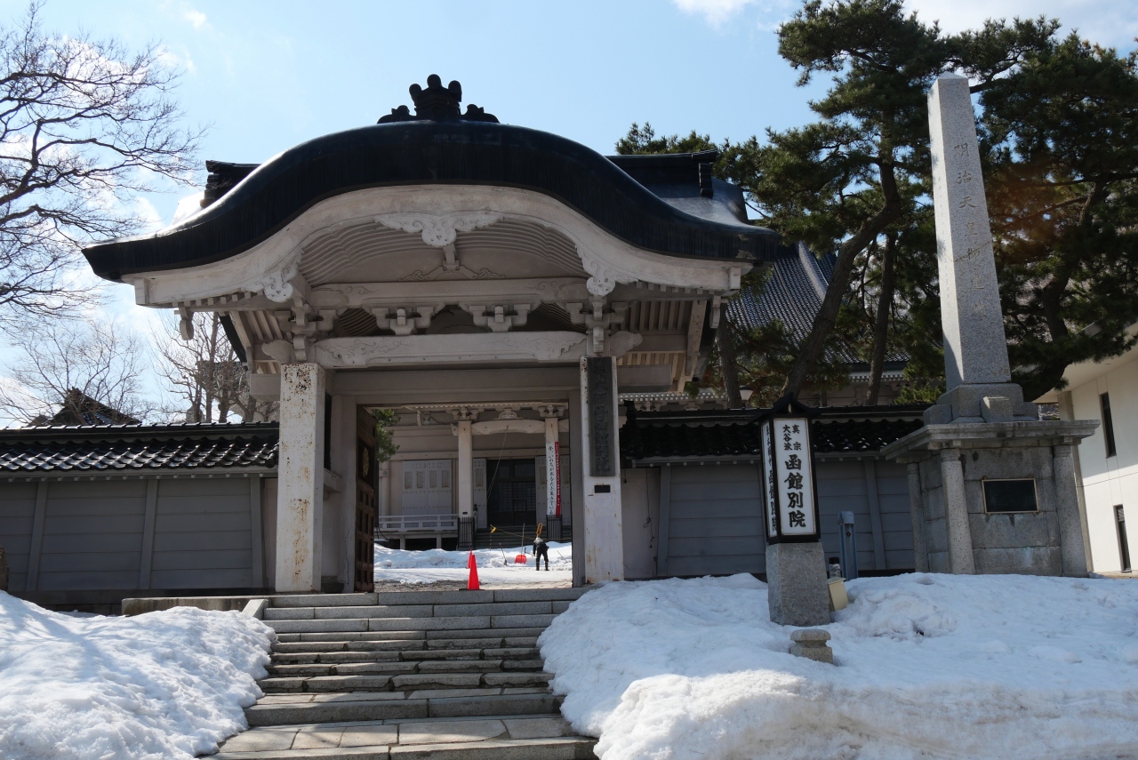 函館公会堂の前の坂道である基坂の真ん中あたりにあります。