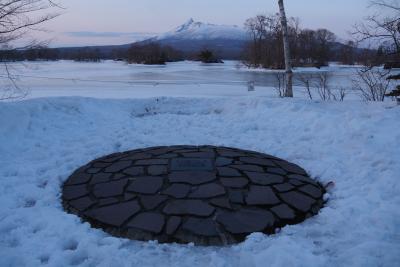 マンホールのようなモニュメント。大沼と駒ケ岳の風景の美しい場所です