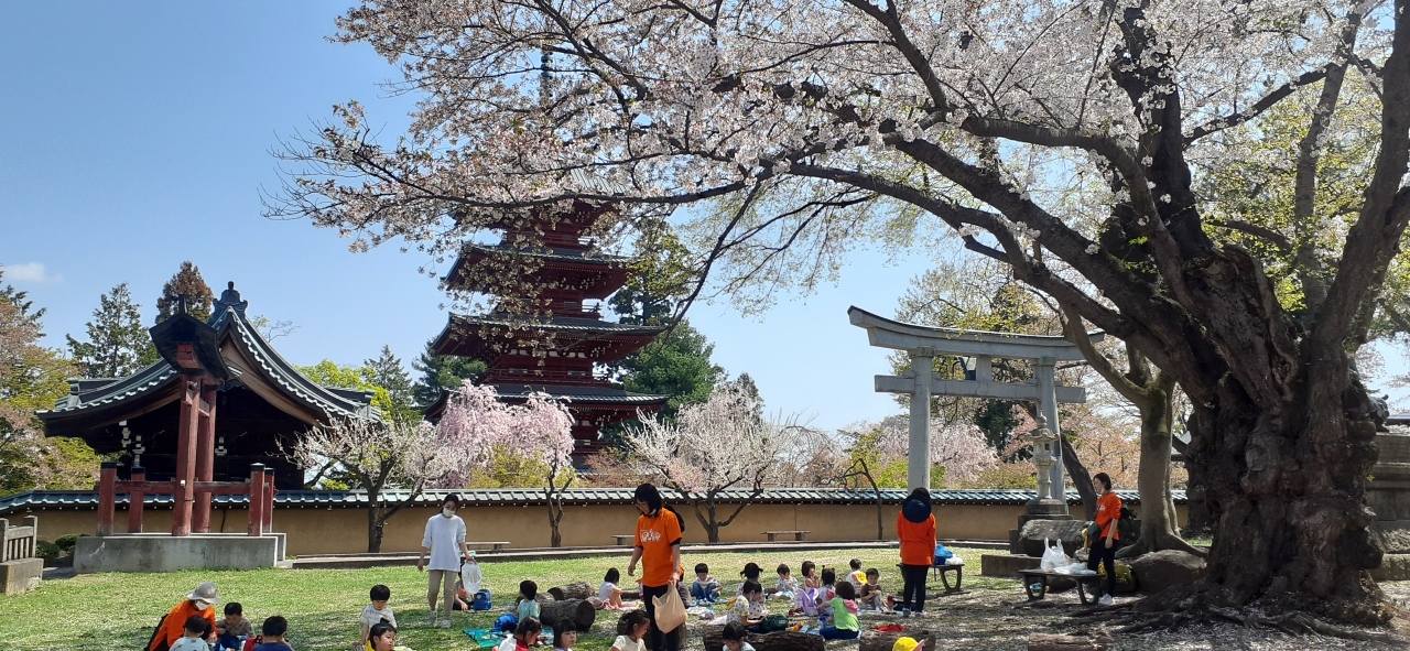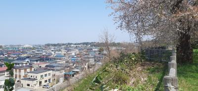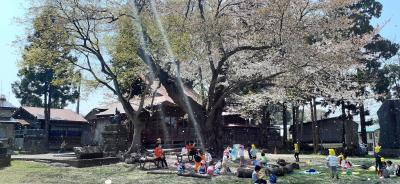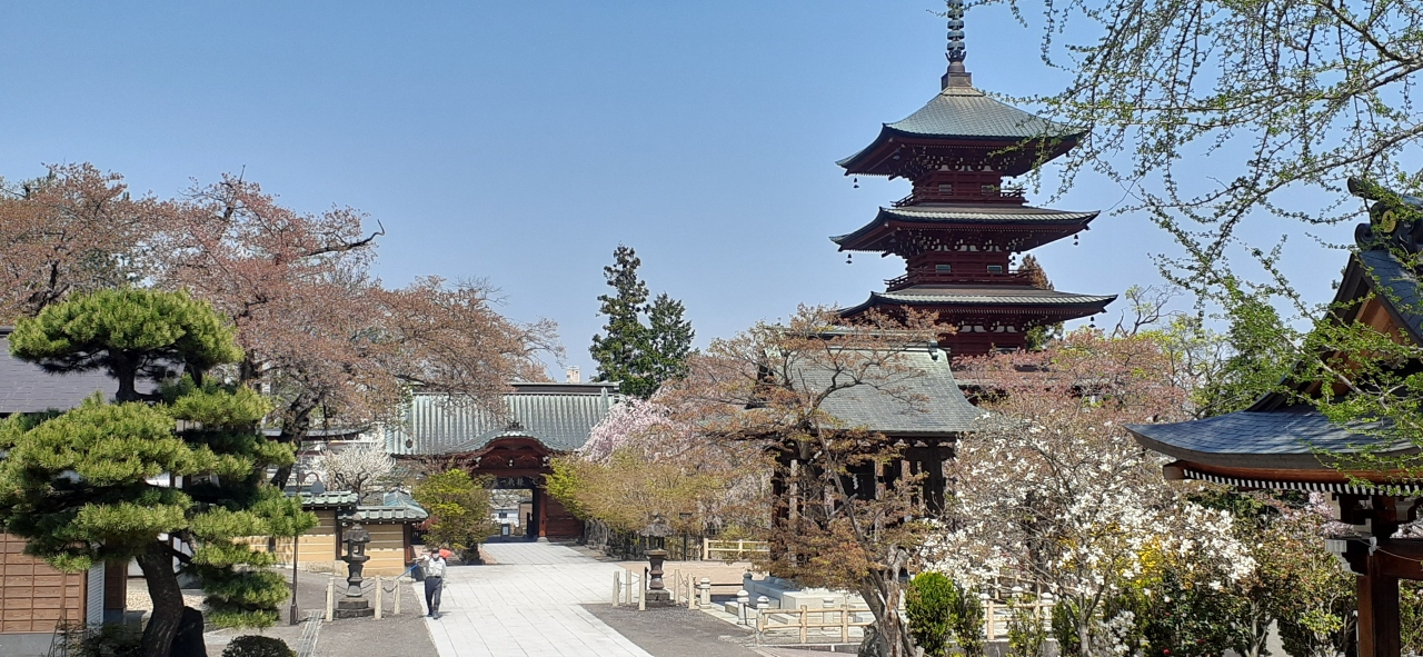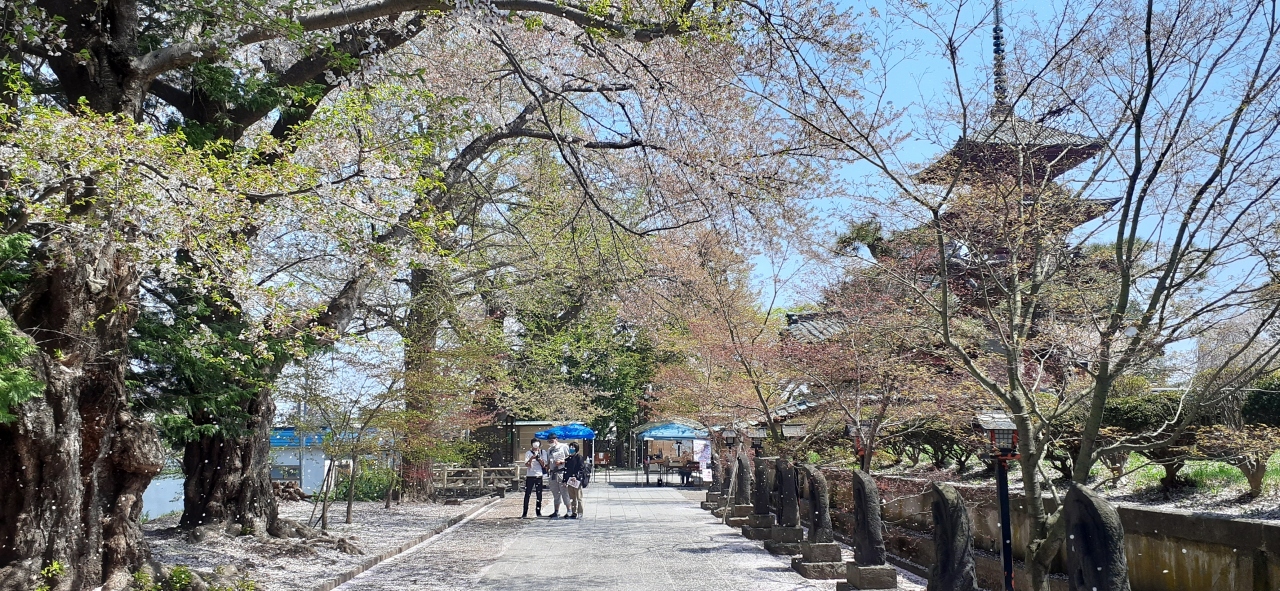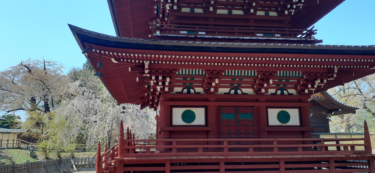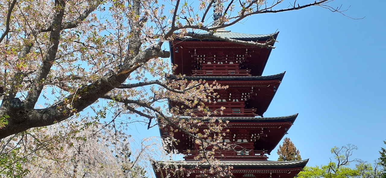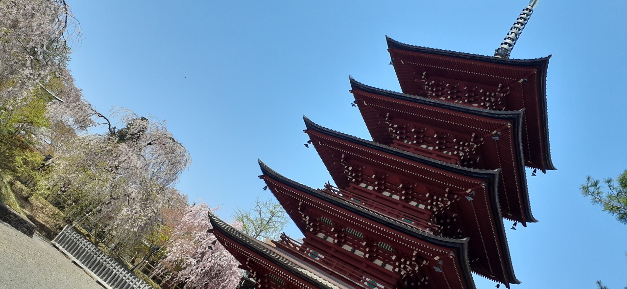 最勝院の隣。桜吹雪が舞っていました。五重塔がきれいに見えます