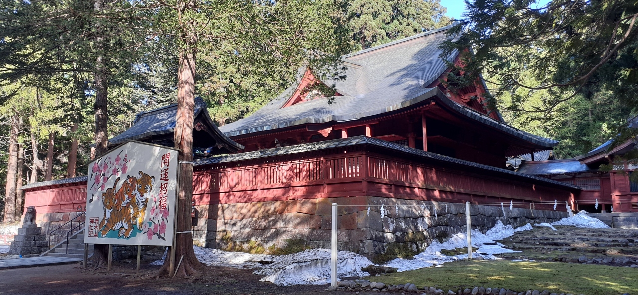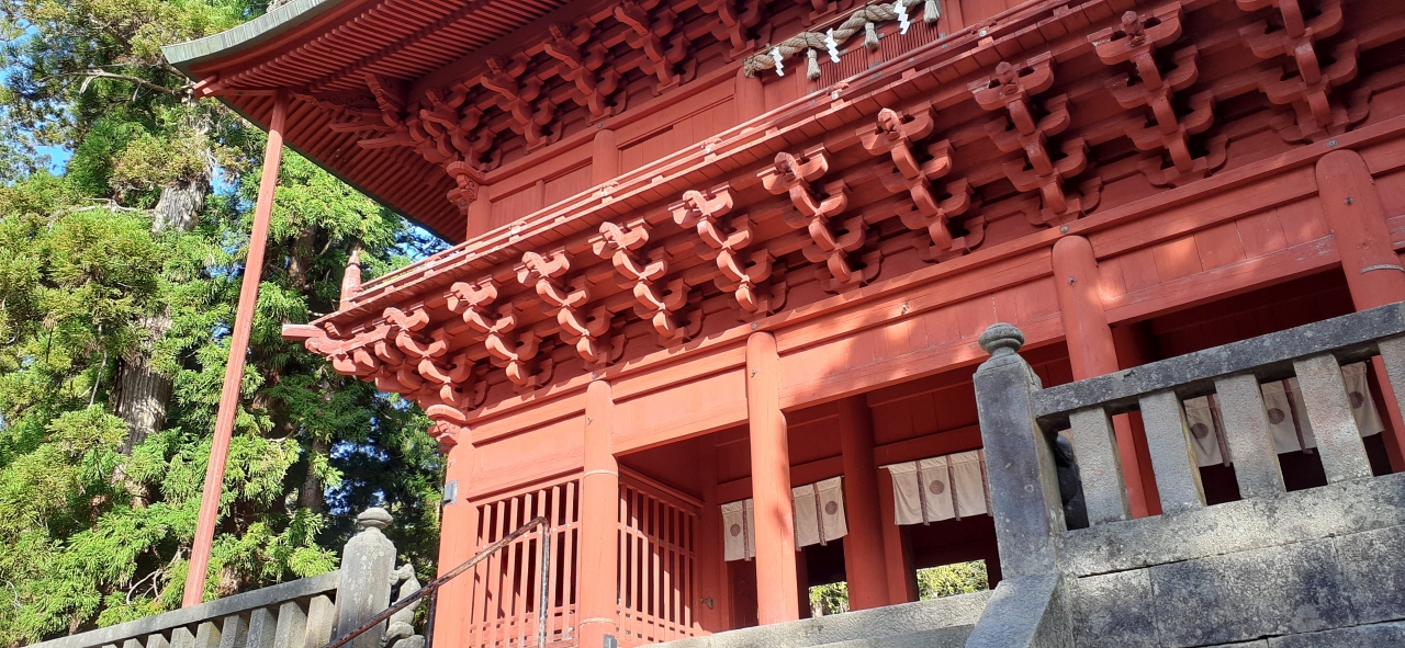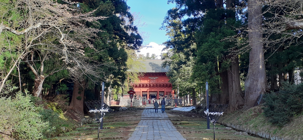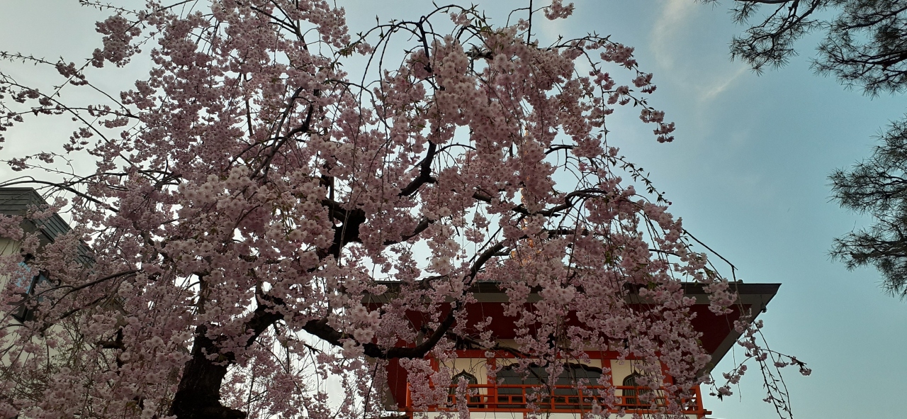 朱色の山門と拝殿がとても印象的で、桜の時期でもあり境内の桜は満開でした。
