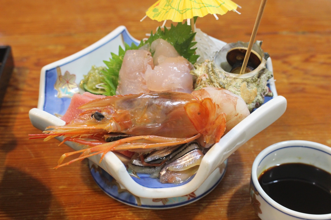 刺身定食1500円を注文しましたが、えび、タイ、サザエ、イワシなどのその日に取れた魚介類の刺身とさまざまな料理がどっさり出てきました。