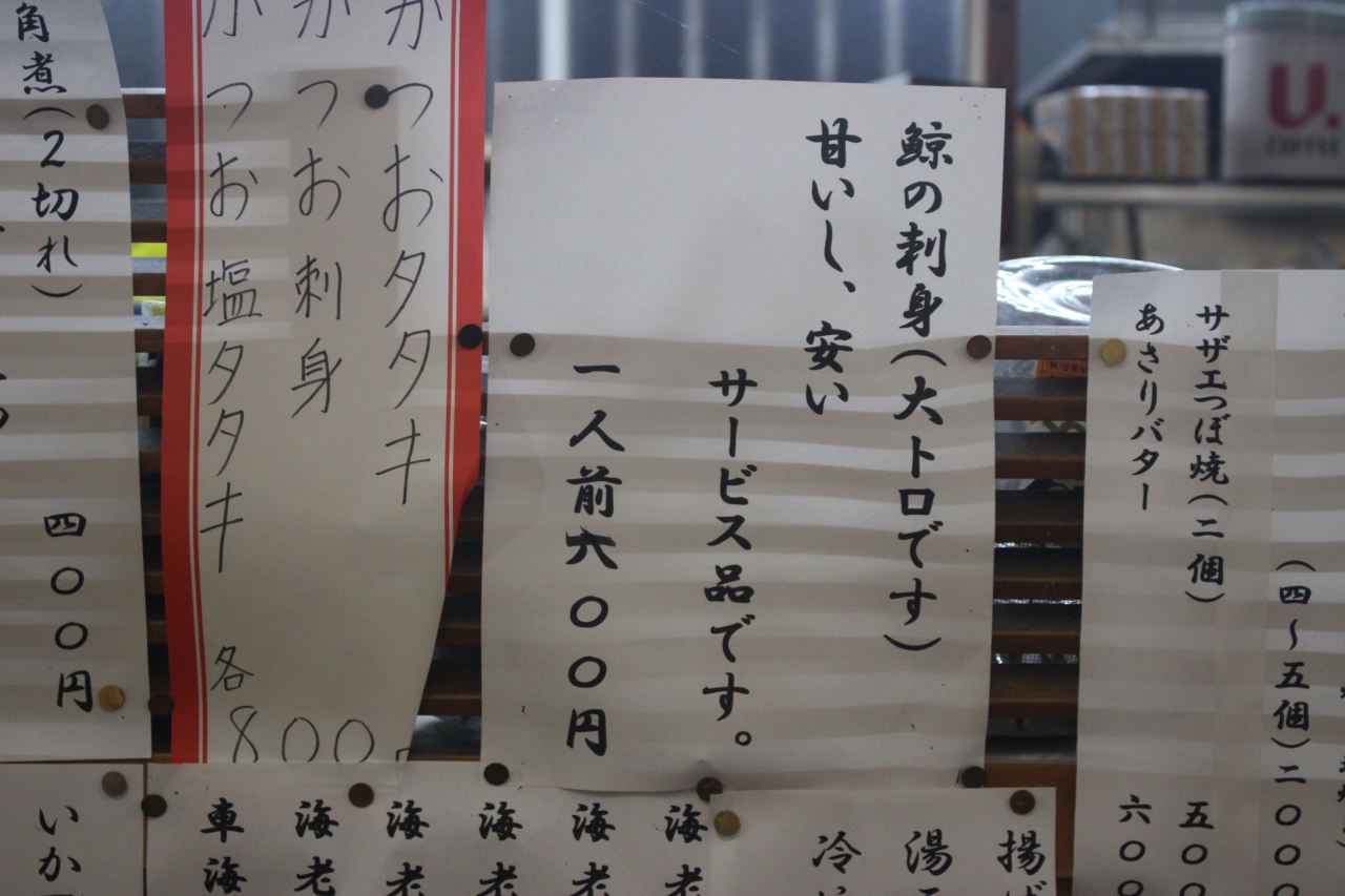 また「クジラ」の刺身600円があるとのことで注文しましたが、トロのようなおいしい刺身でした。