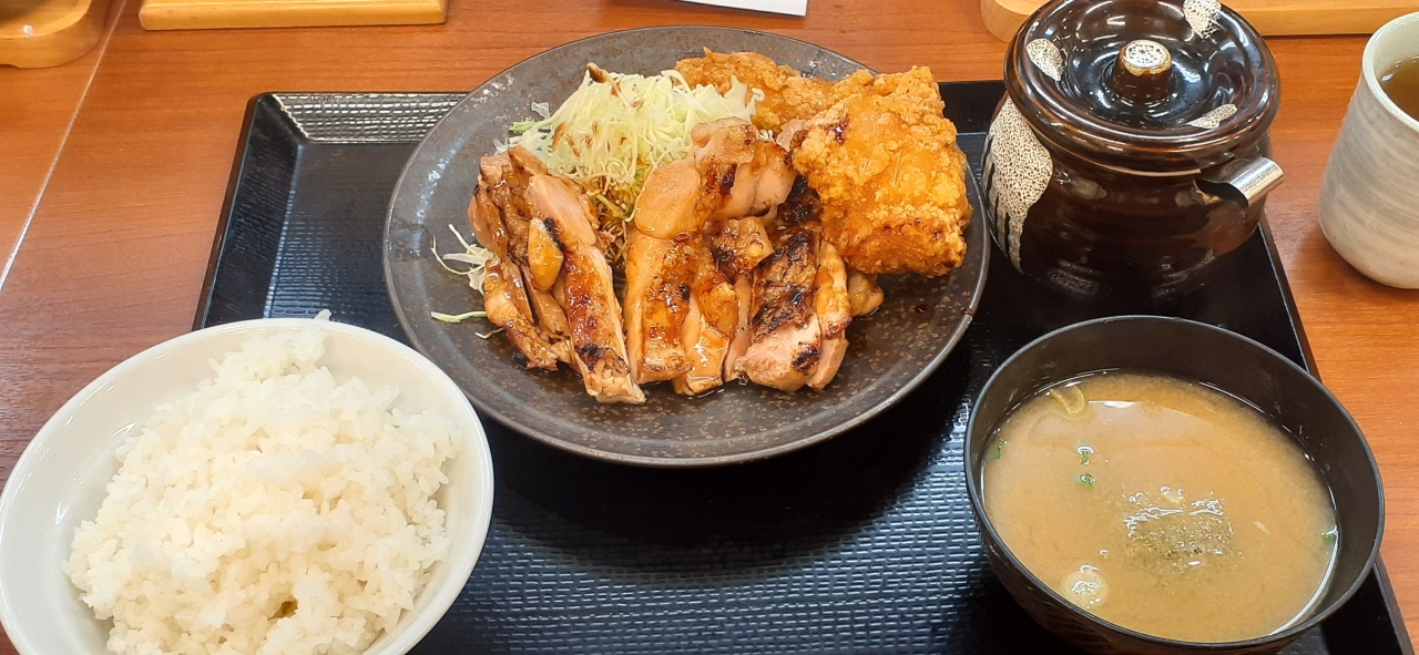 からあげがメインのお店ですが、焼き鳥肉もあり、今回は両方ミックスされた定食を注文しました。