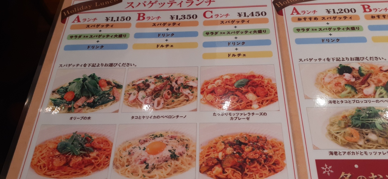 ランチの時間に行きましたが、スパゲッテイ、ドリンク、デザートがセットで1200円~ほどでした。