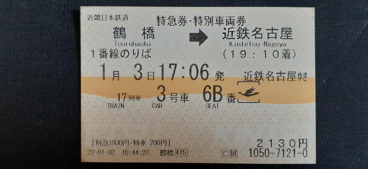 大阪鶴橋駅から名古屋駅まで乗車しました。