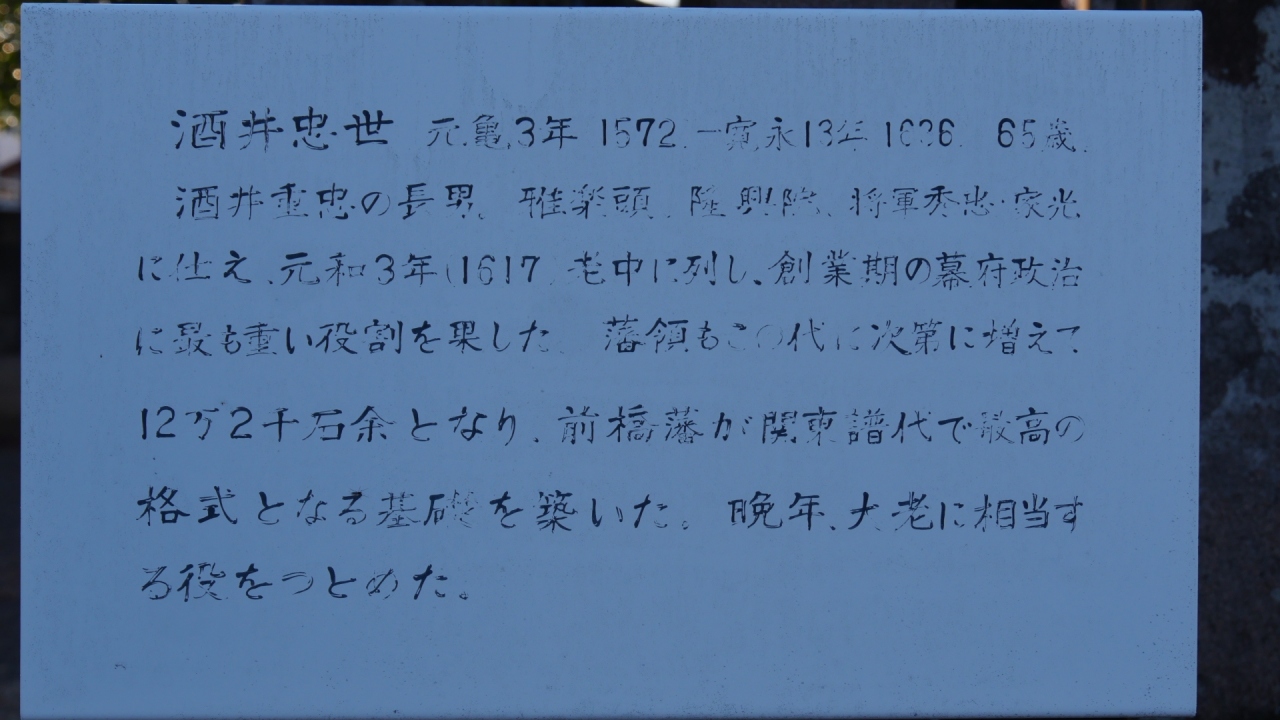 初代・重忠、2代・忠世のお墓が立派なのは徳川家康を助けた功臣であり納得でしたが、「下馬将軍」と言われたほどの権力者だった4代・忠清のお墓はさほどでもなかったのはちょっと意外でした。- 旅行時期