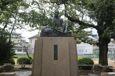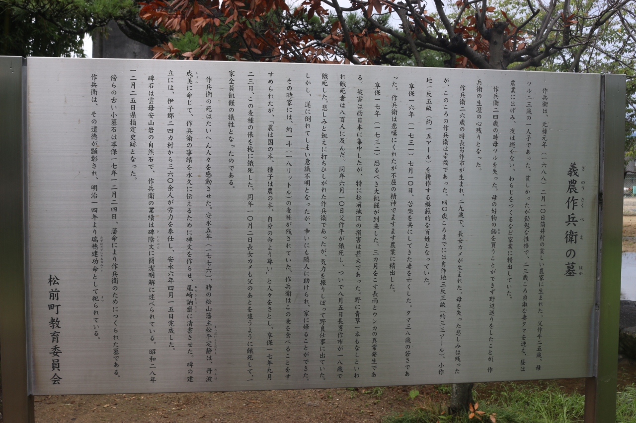 享保の大飢饉(徳川吉宗の時代)のとき、種もみを食べることを拒否して、餓死したとされる義農佐兵衛をまつる義農神社は伊予鉄道・郡中線の松前駅から歩いて5分ほどです。