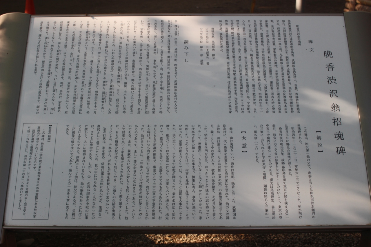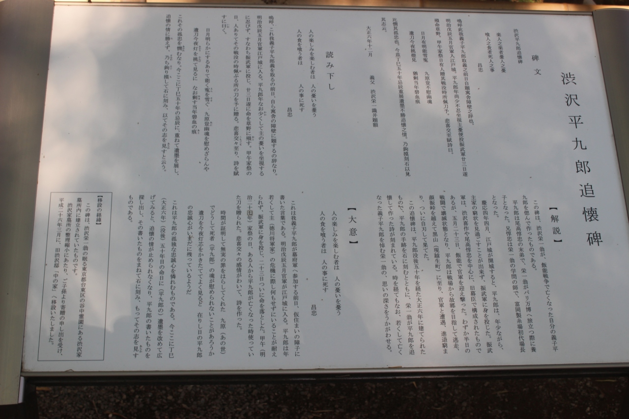 敷地は広く、渋沢栄一の父や母、若くして死んだ養子・尾高平九郎の石碑等があります。