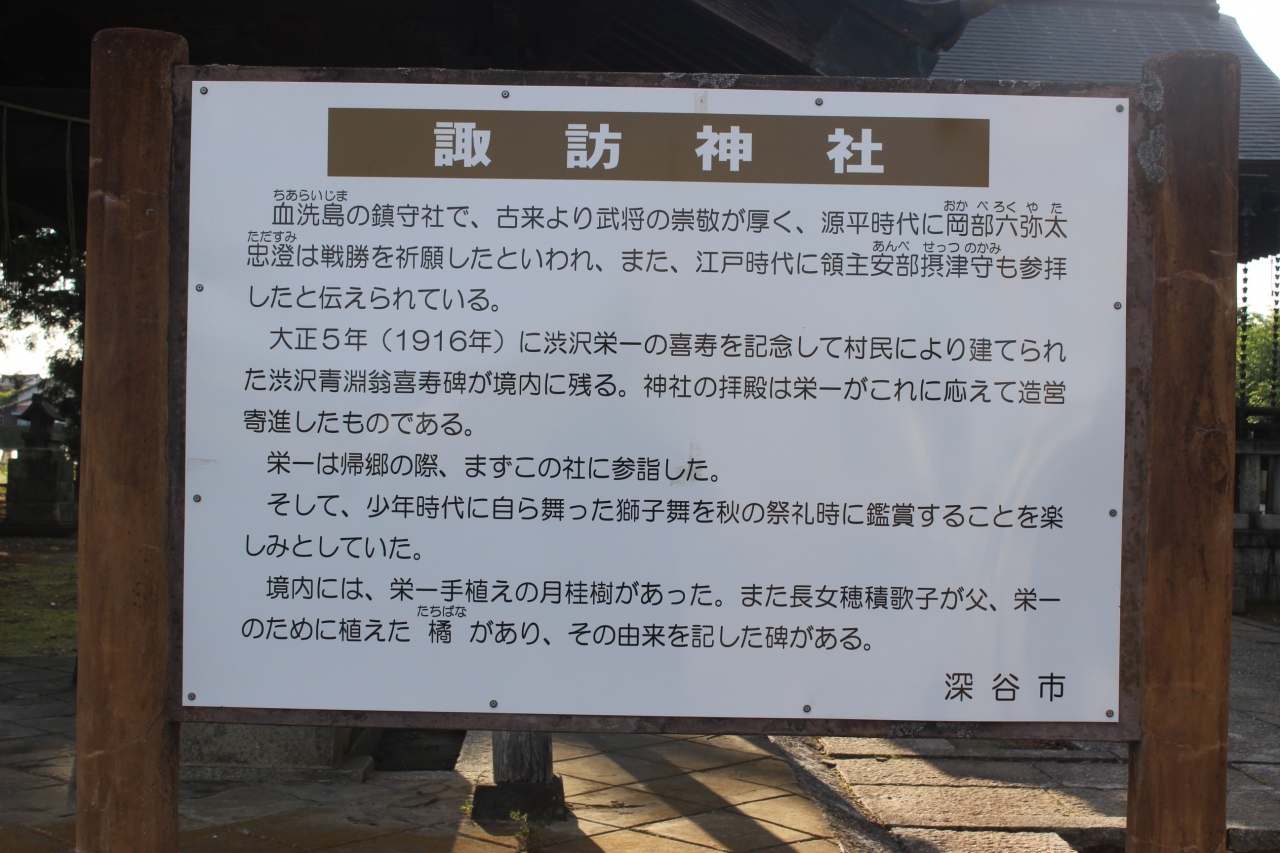 また歩いてすぐのところにはこのあたりの氏神で渋沢栄一ゆかりの諏訪神社もあります。- 旅行時期