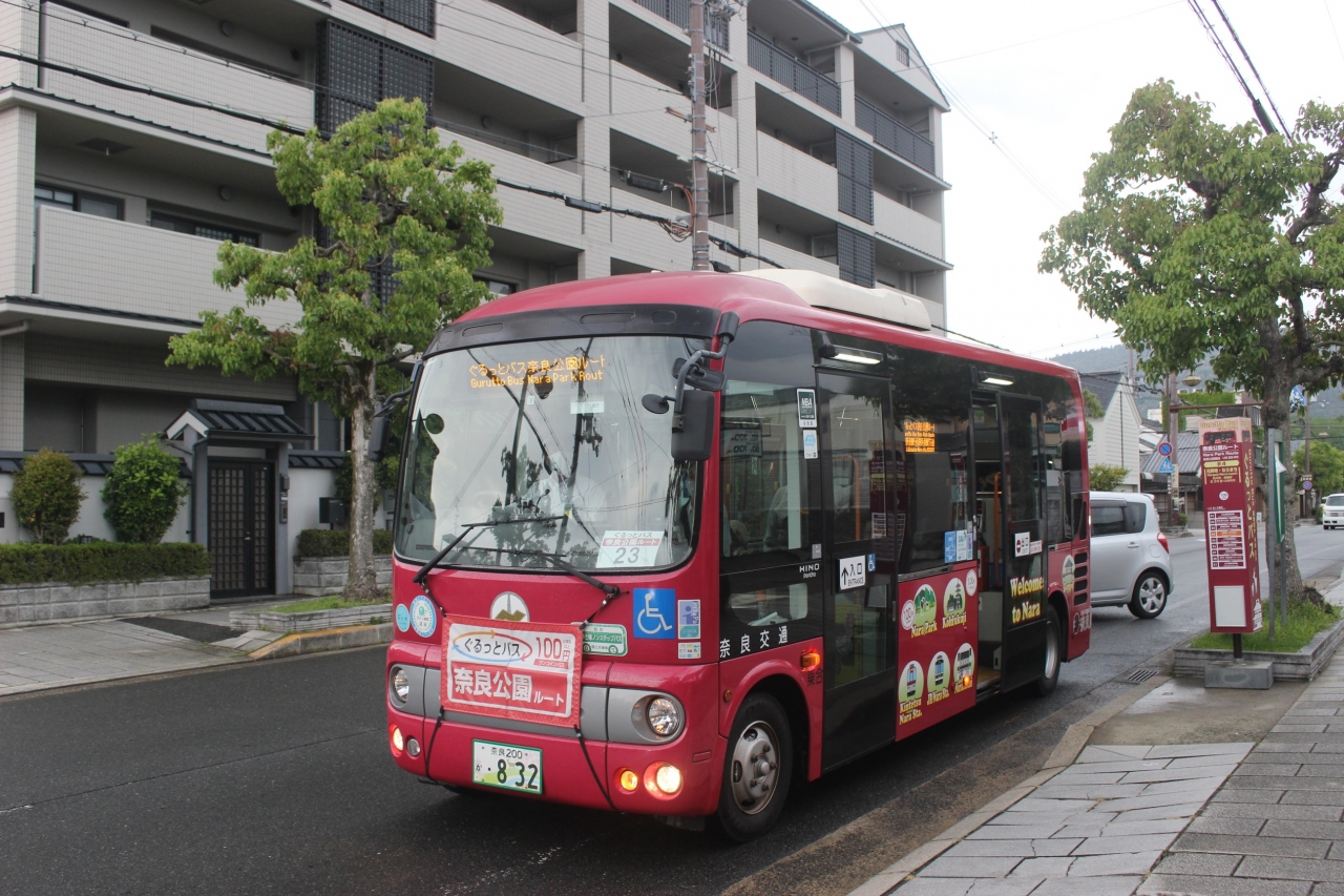 東大寺等奈良公園を駅から一周する赤いバスと平城京へ向かう青いバスがあります。
