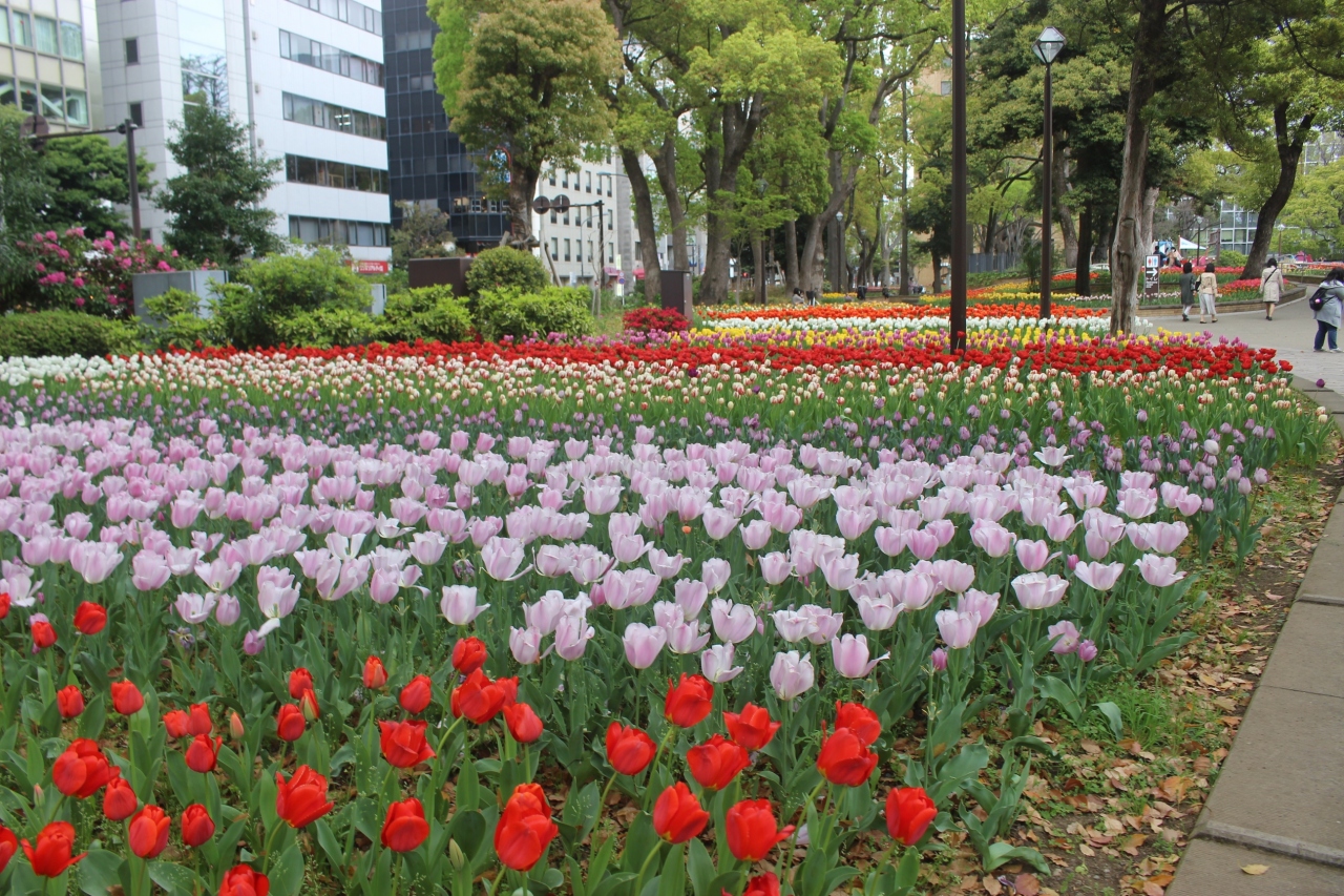4月4日に行きましたが、公園内は様々な色のチューリップが見事に咲いていました。