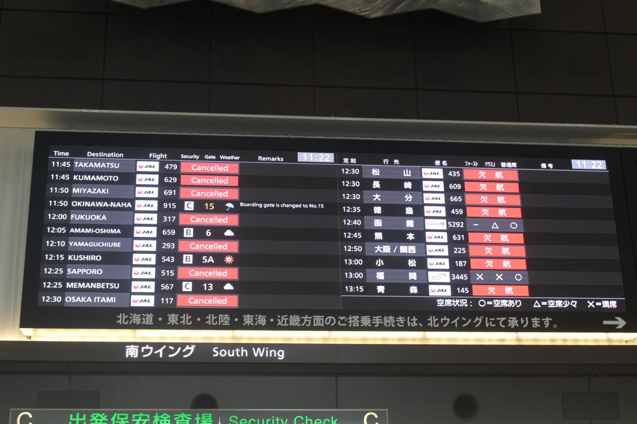 また出発便の案内も「欠航」「CANSSEL」の便が多かったです。