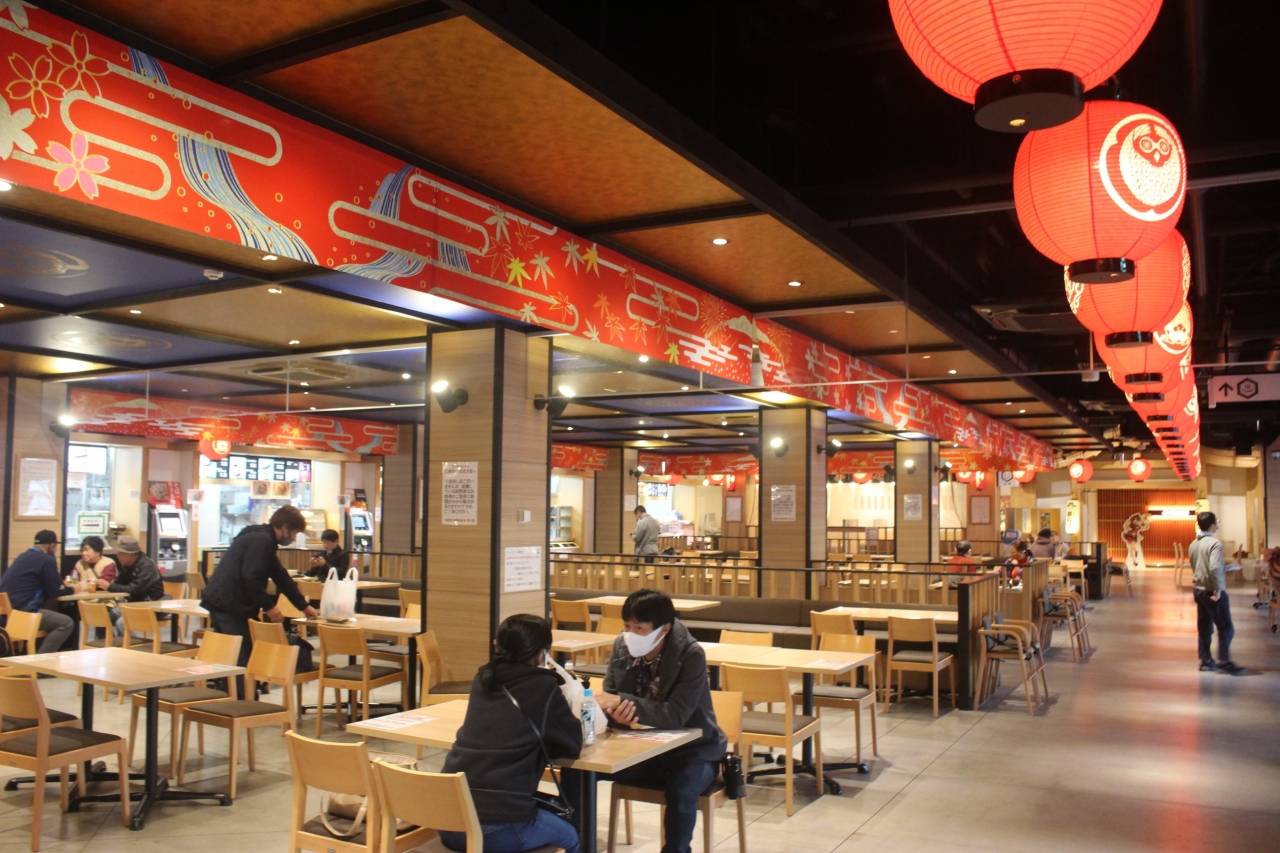 駅から入るとまずはお土産物店街、そのあとフードコート、一番奥に温泉があります。