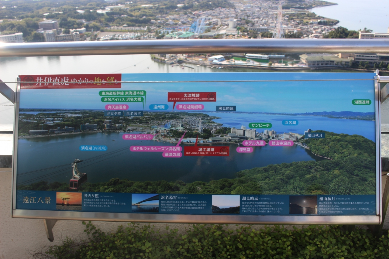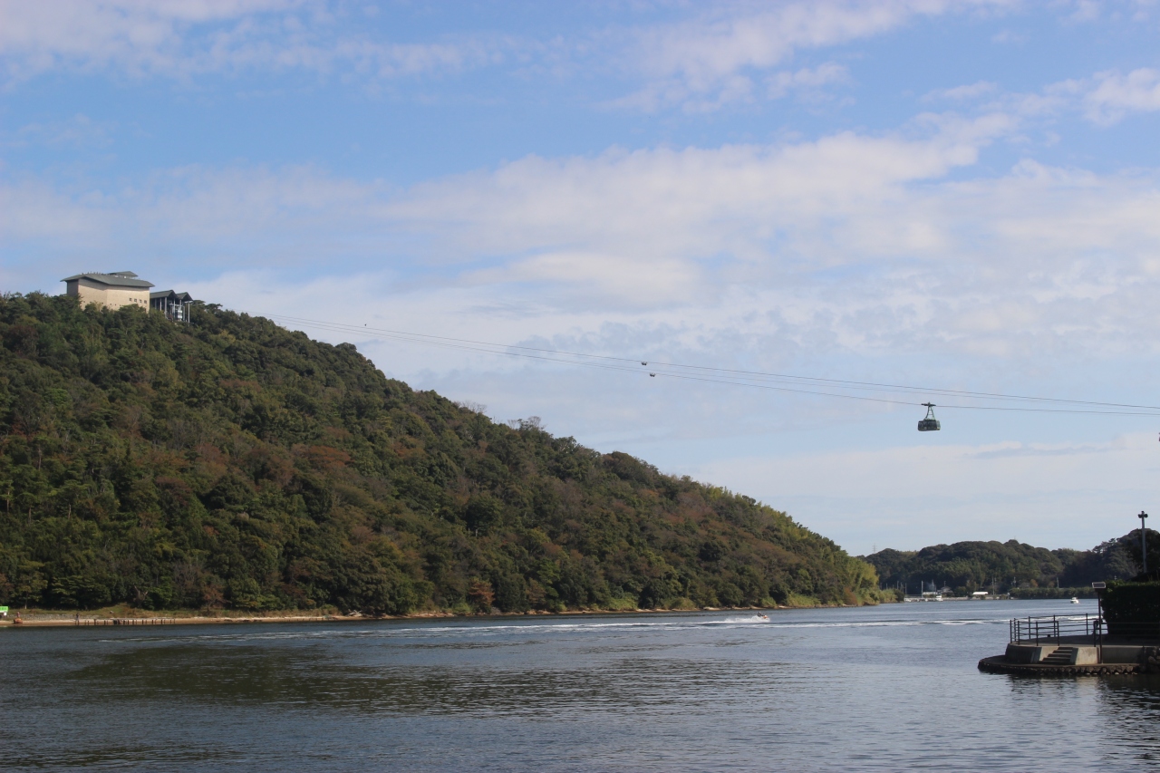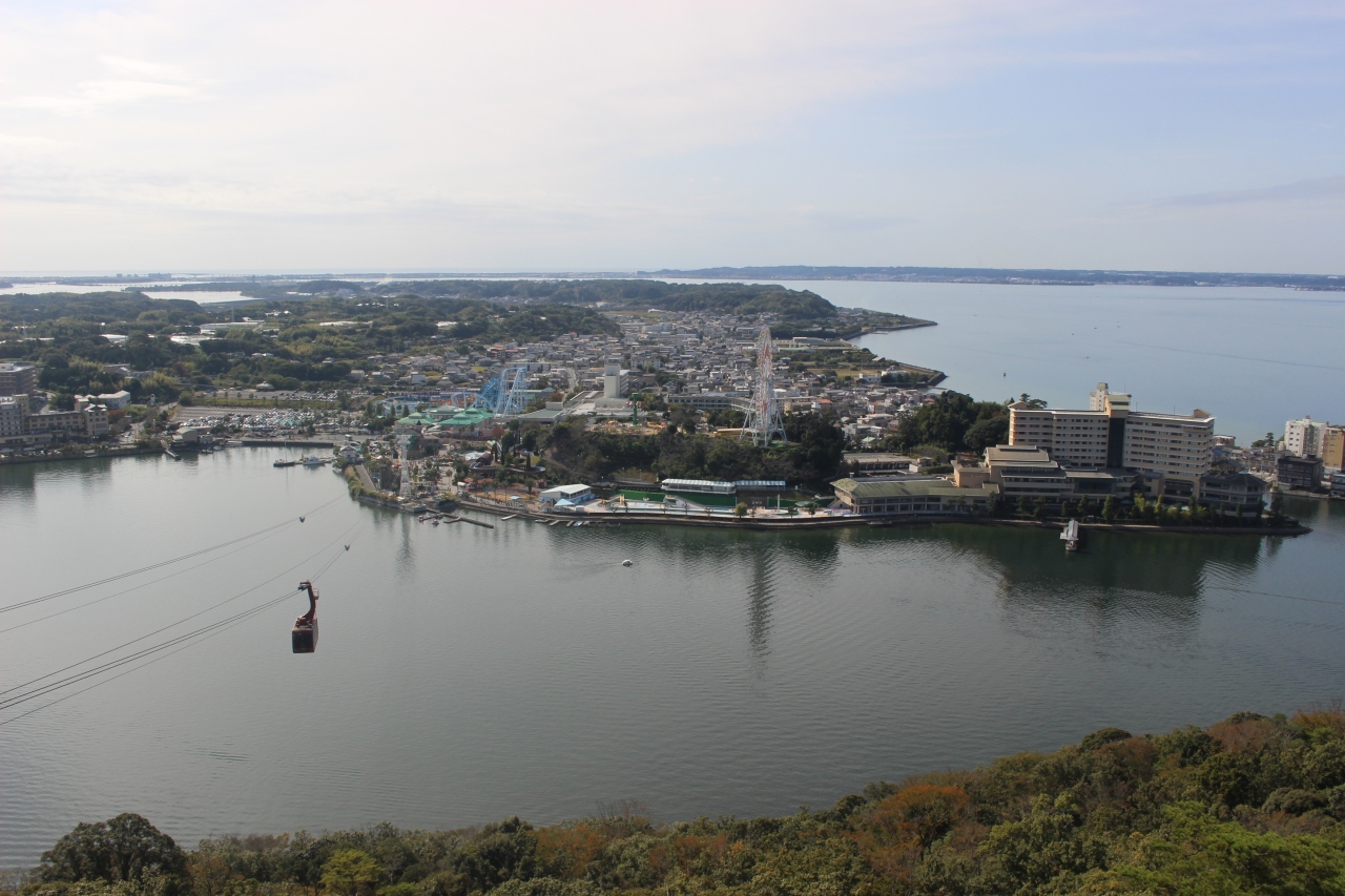 ここからロープウェイに乗ると、浜名湖の湖面の上を横断して大草山の展望台まで行けます。