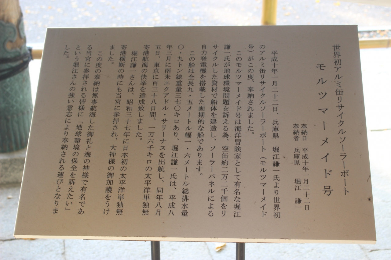 また堀江謙一さんが太平洋横断に使用したアルミ缶で作ったモーターボートも展示されています。- 旅行時期
