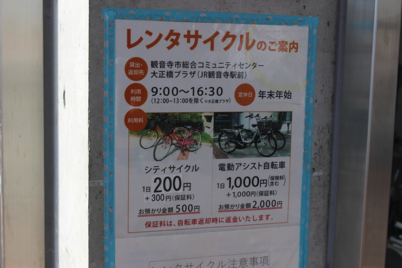 琴弾公園などは駅から2キロ程度なので、「ままちゃり」で十分ですが、雲辺寺に行きたかったので、電動レンタサイクルを借りました。