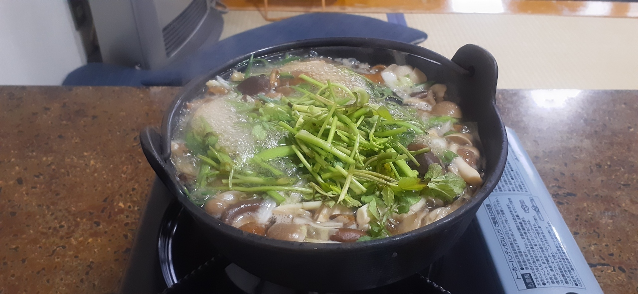 おすすめの「山菜そば」を注文、1500円と高めでしたが、なべにどっさり山菜が入っていて、「山菜そば」というより「山菜なべ」でした。