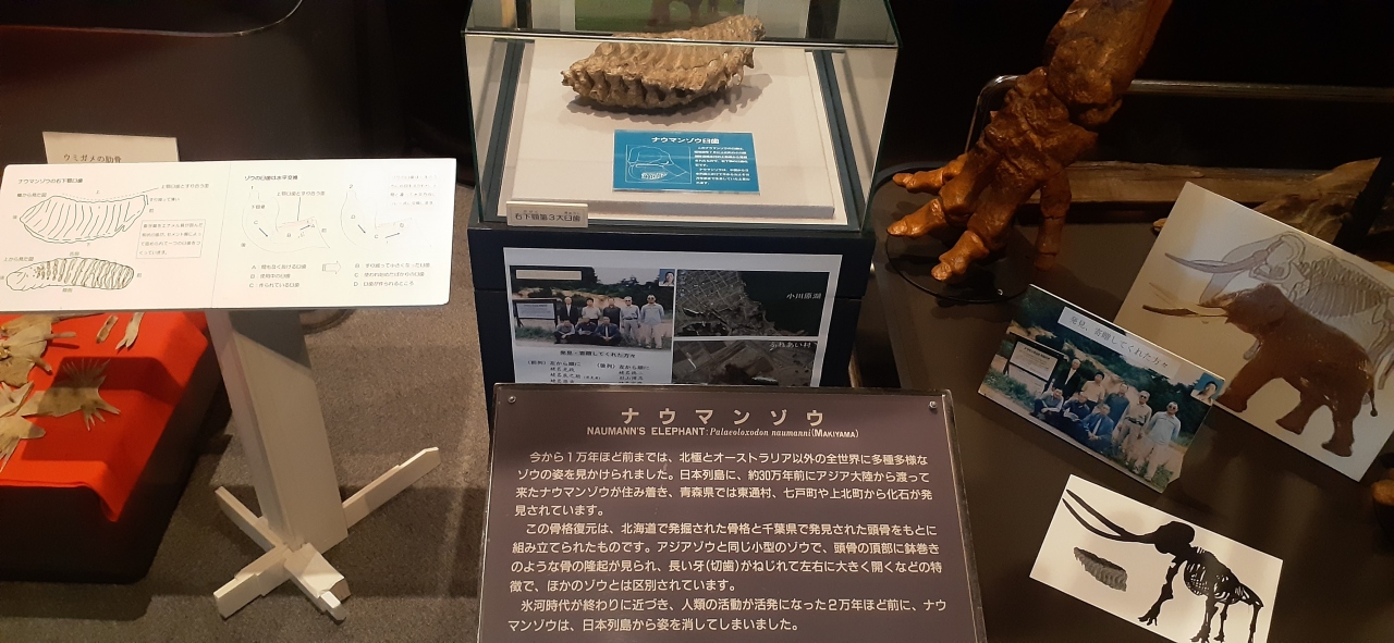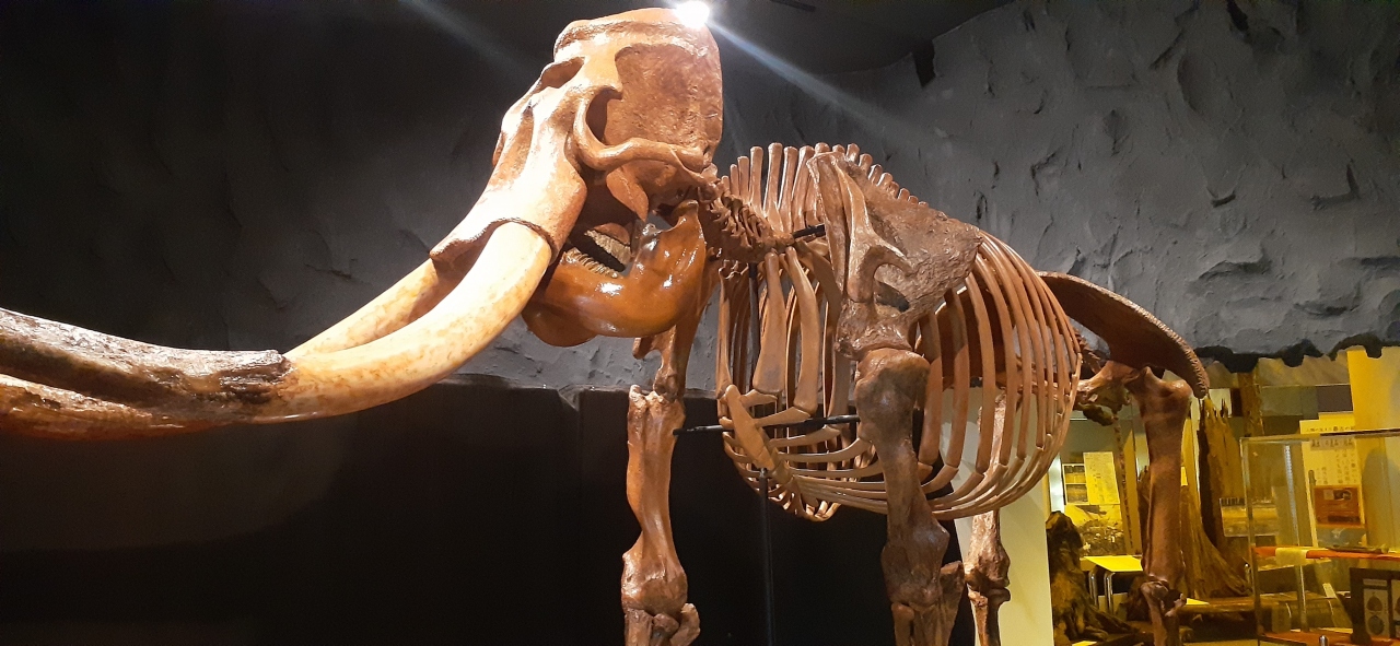 なんでもここではナウマンゾウの骨が発見されたとかで、ナウマンゾウの骨格標本がお出迎え。