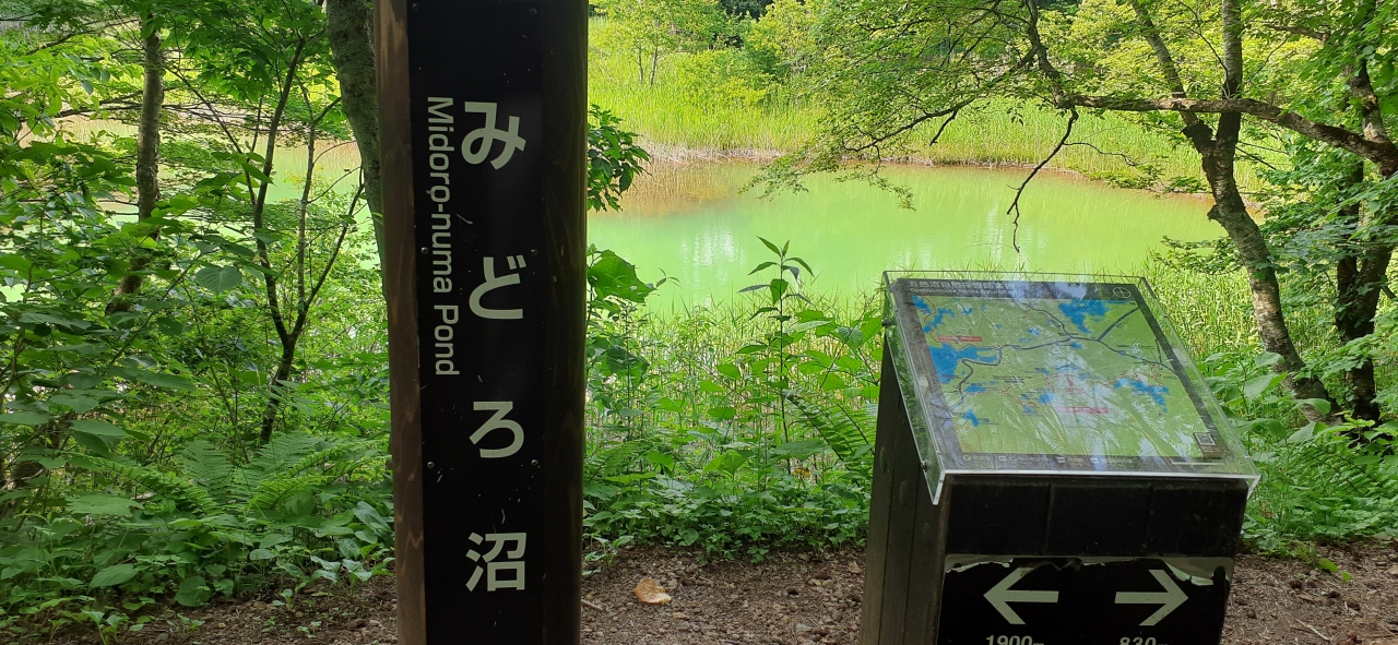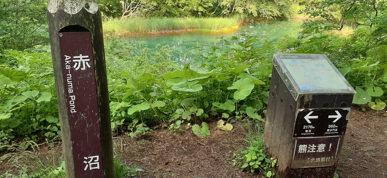 路線バスで五色沼入り口バス停で下車、目の前に広い駐車場があります。