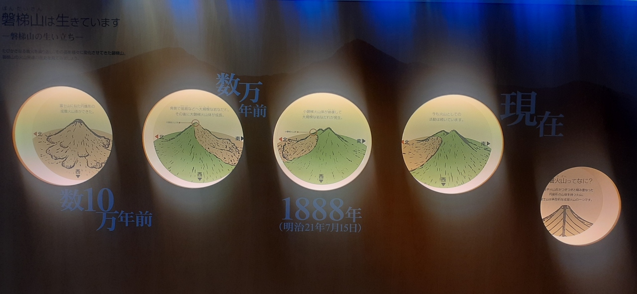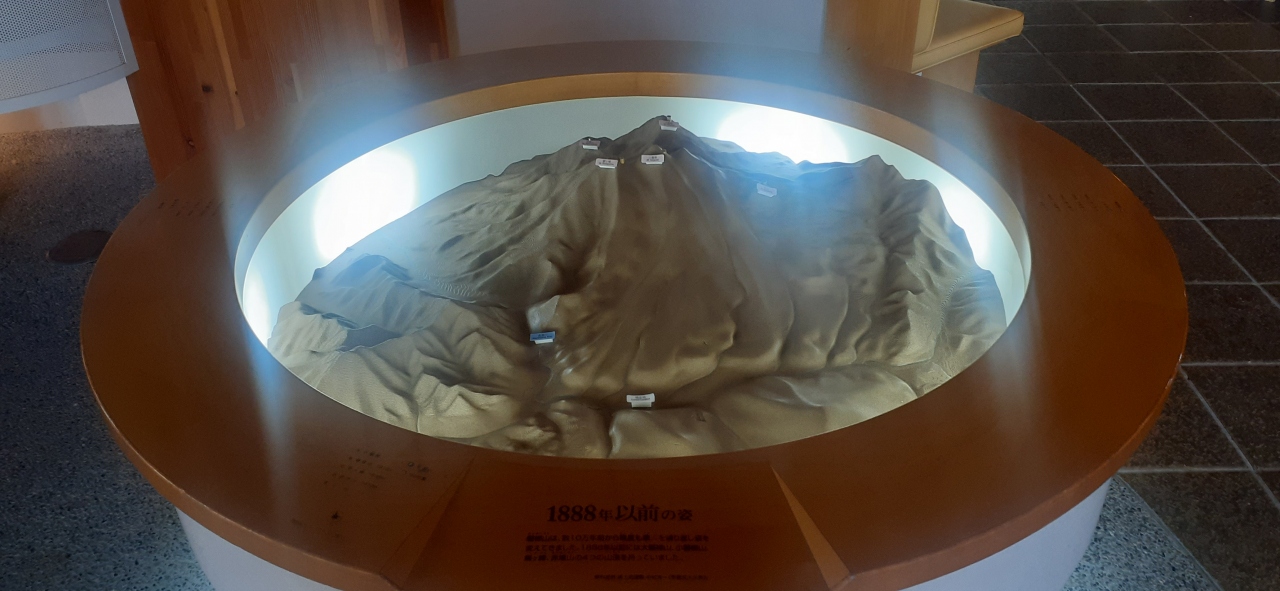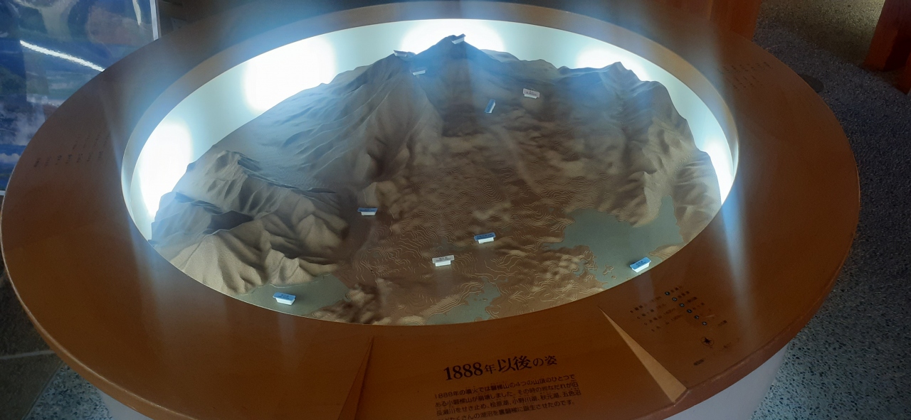 1888年、明治時代に磐梯山が噴火して、その前と現在の磐梯山の模型や、このあたりで生息している動植物についての展示、説明が多くあります。
