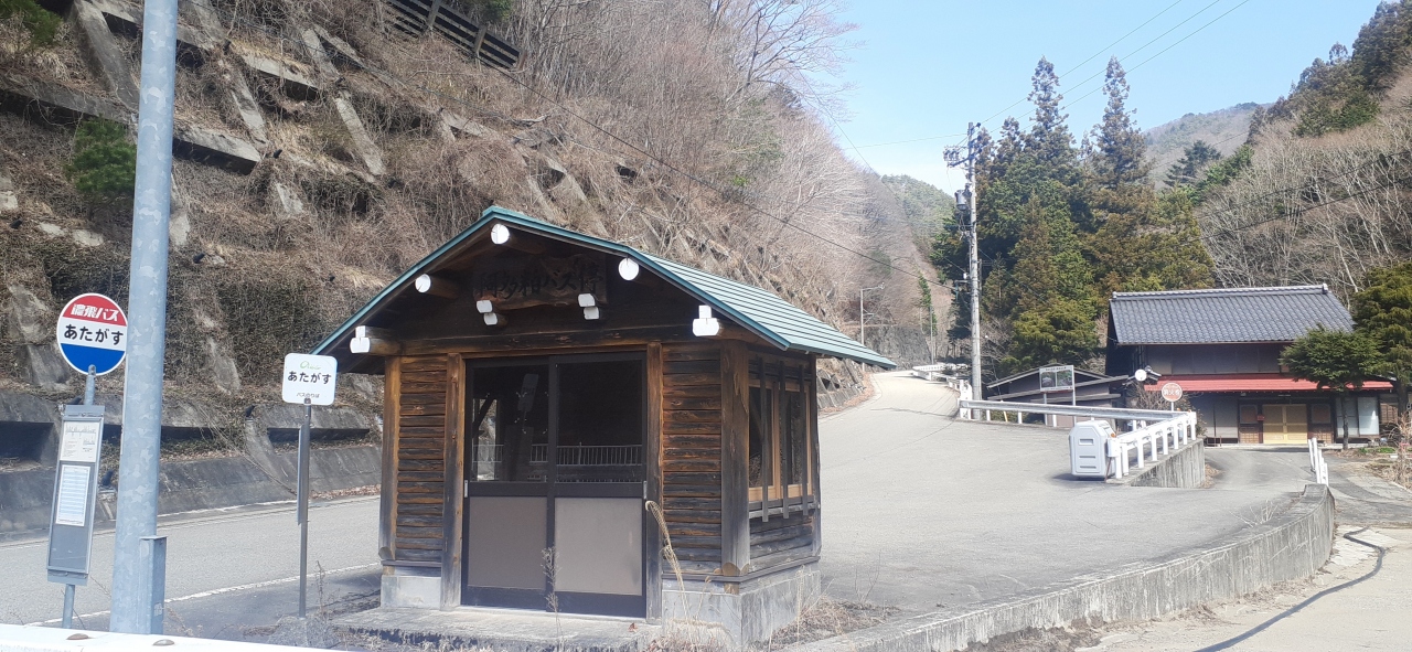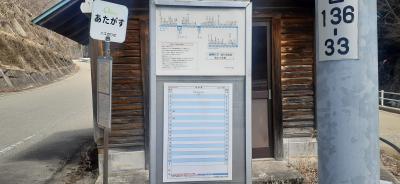 かつては1時間に1本バスがあったのですが、ショートカットするトンネルが完成して、ほとんどのバスはトンネル経由になり、松尾バス停を通る「あたがすバス停」経由は1日2本になっていました。