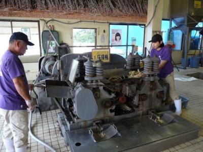 ホテルを8時半に出発して、沖縄黒糖工場に行きました。サトウキビを搾って...