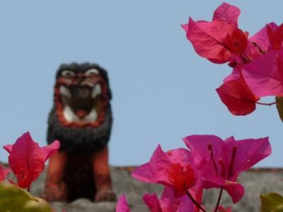 屋根の上にかわいいシーサー(-ω☆)キラリブーゲンビリアの花とよくマッ...