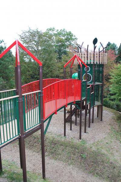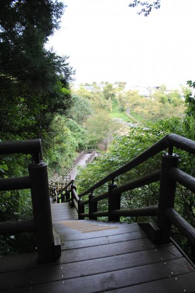 駐車場からタイミングが良ければ、列車型の乗り物に乗って屋内施設まで行けるのですがこの日はタイミングが合わず、歩きました。入場後、正面に童話村の施設が見えるのですが、ちょっとそれて山側の遊歩道を歩いてみました。