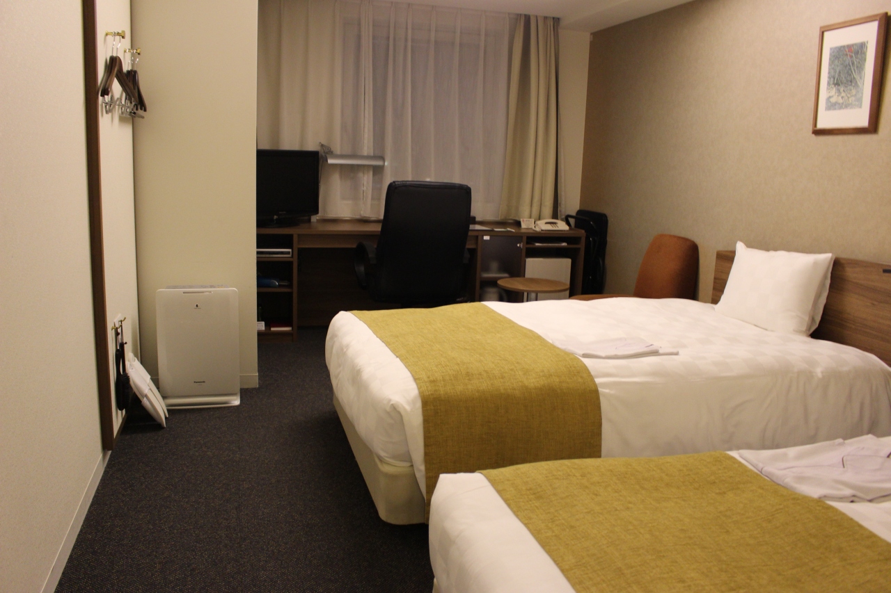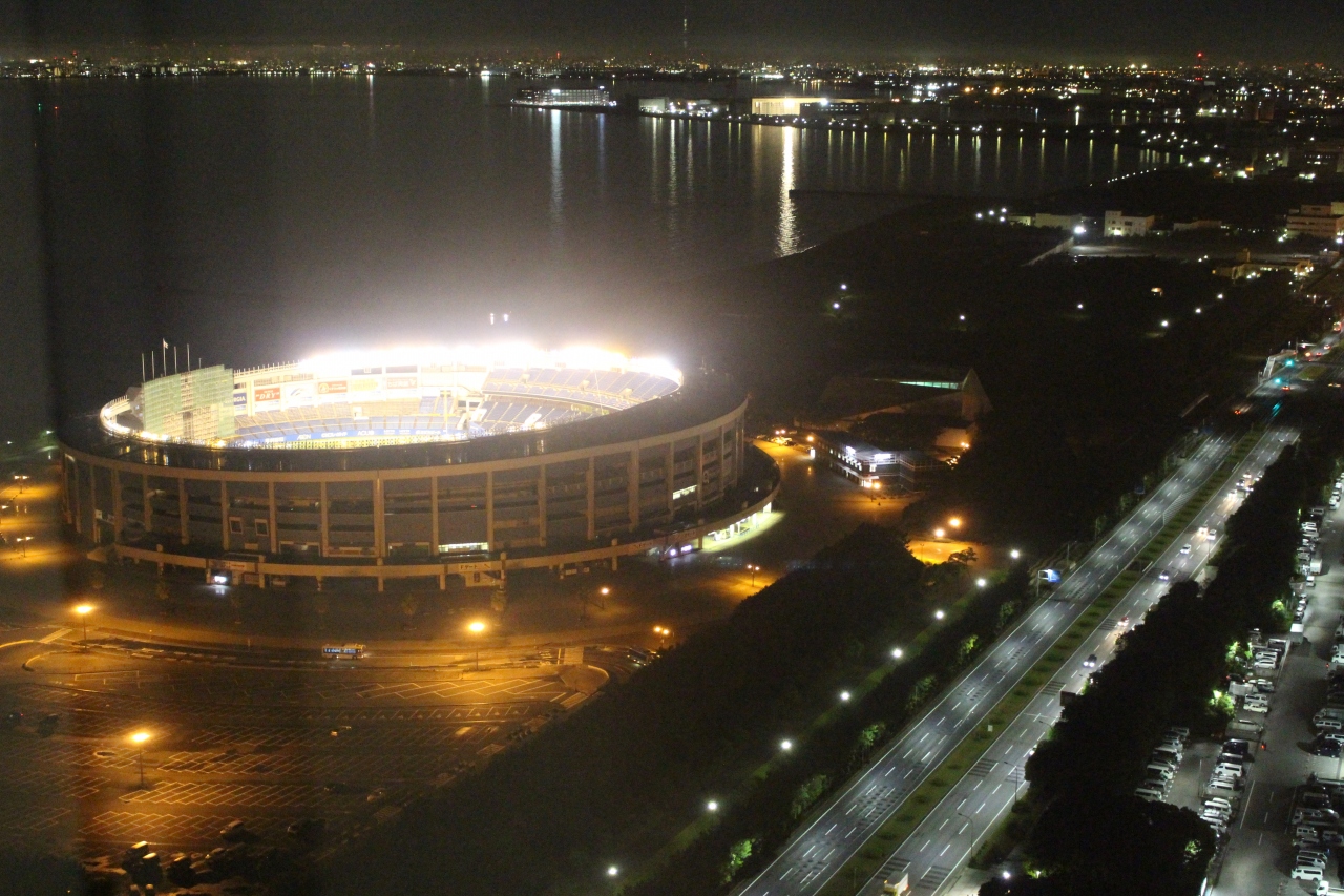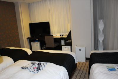 エクスペディアで直前にアパホテルを予約。土曜はどこも高かったのに直前で3名+添い寝2名のトリプルルームで10800円でした。食事は付きませんでしたが、大浴場と洗濯機、乾燥機があるので快適に過ごせました。部屋は球場やイオンモールが見える部屋です。眺めが良く広々としていました。