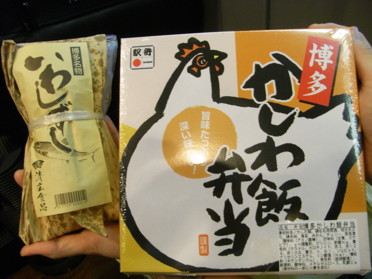 新幹線の改札口を在来線へ乗り継いだ、すぐ左側にある売店で購入しました。九州・福岡の代表的な味の駅弁で、両方ともおいしかった。左の寿司は鯖もあって、こちらもいける。酒の友に最高。