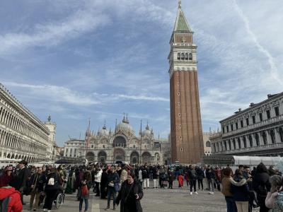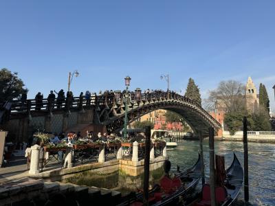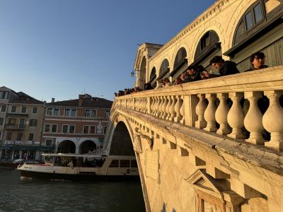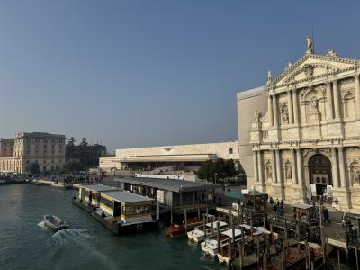 イタリア本土からベネチアの観光の中心であるサンマルコ広場へ行く場合、ベネチア本島の入口にあるローマ広場やサンタルチア駅まで車や鉄道で行き、そこから先は徒歩か船になります。歩いても30分で行ける距離ですが、石でできた道の凹凸があったり、何度も運河を渡る橋を渡ったりするので、荷物があると大変です。ローマ広場やサンタルチア駅の前には水上バス乗り場があり、そこからサンマルコ広場まで9.5ユーロで行くことができます。水上バスはグランドカナルを通っていくので、運河からのベネチアの街並みを見ながらサンマルコ運河まで行くことができます。途中、リアルト橋やアルカディア橋をくぐったりと、交通手段というだけでなく、観光の乗り物としても、水上バスは便利です。