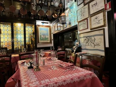 サンマルコ広場から200mのところ、運河沿いに建つレストランで、店内はピンクを基調としたテーブルクロスで、かわいらしい雰囲気になっています。このレストランでは、この日に獲れた魚介を中心にしたメニューを、ウェイターが黒板で説明して、お薦めしてくれます。