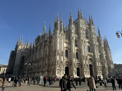 地下鉄ドゥーモ駅で降りて地上に上がると、目の前に巨大なドゥーモが現れます。正面から見ると、高さ108m、幅92mの大きさで、建物に突き刺さって見える100本を超える尖塔は壮観です。1400年ごろから約500年をかけて建造されたもので、最後にはナポレオンの手によって完成されたといわれています。